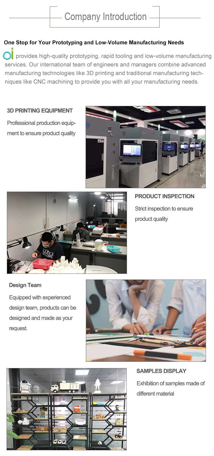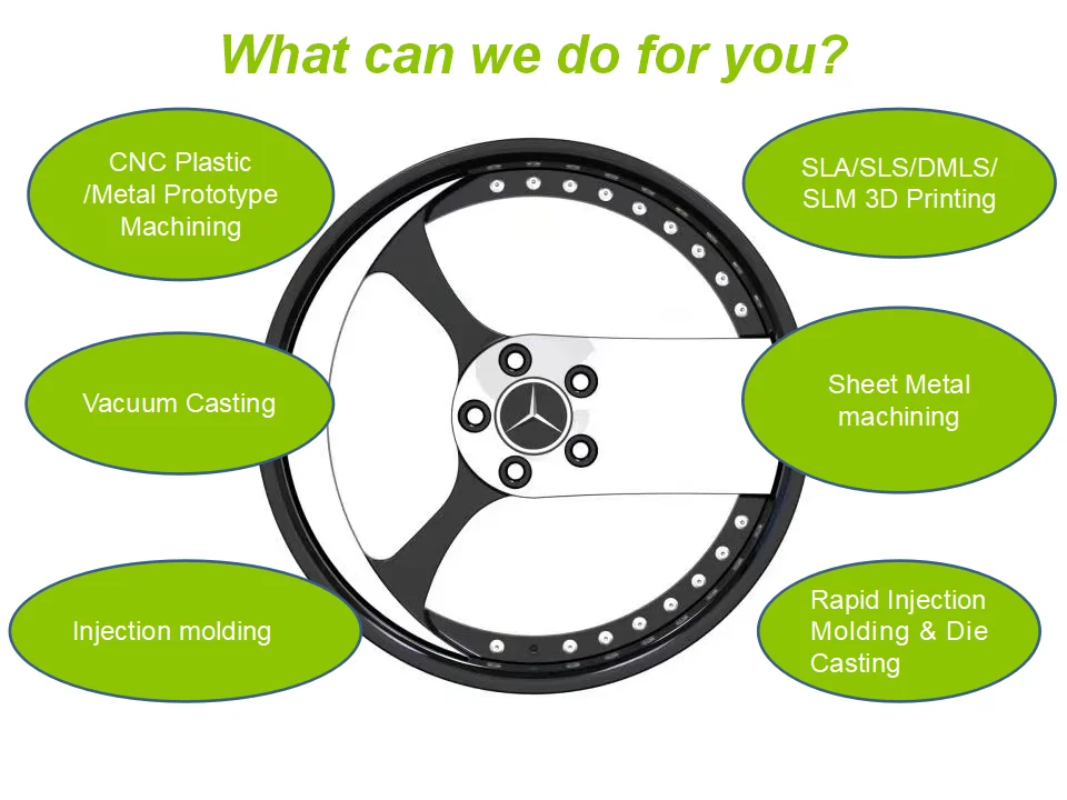 What we can do ? | CNC Plastic/Metal Prototype Machining SLA/SLS/DMLS/SLM 3D Printing Vacuum Casting Sheet Metal machining Injection molding Rapid Injection Molding & Die Casting |