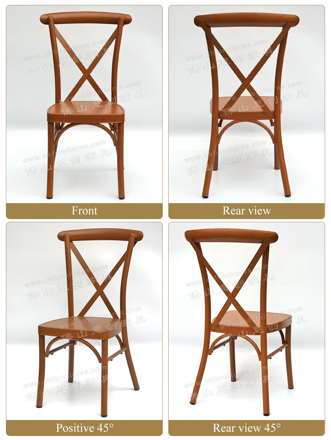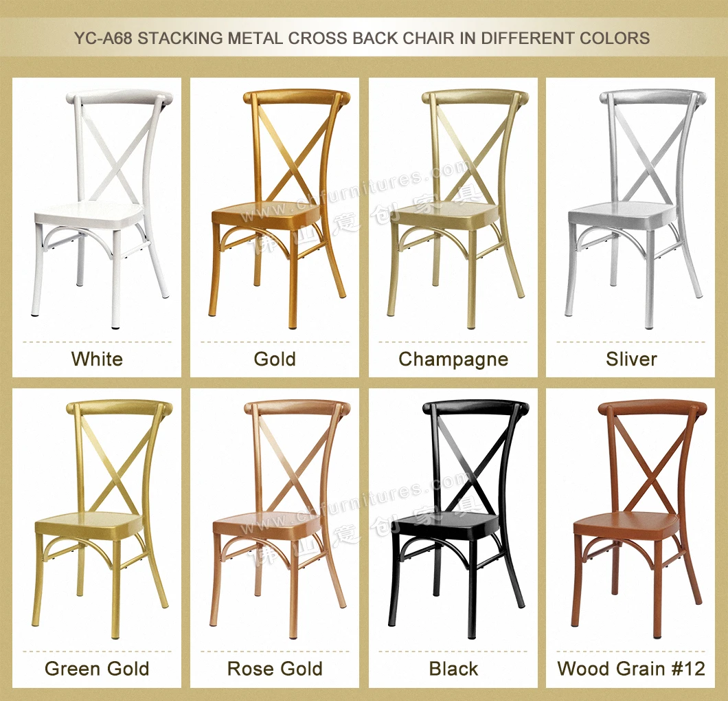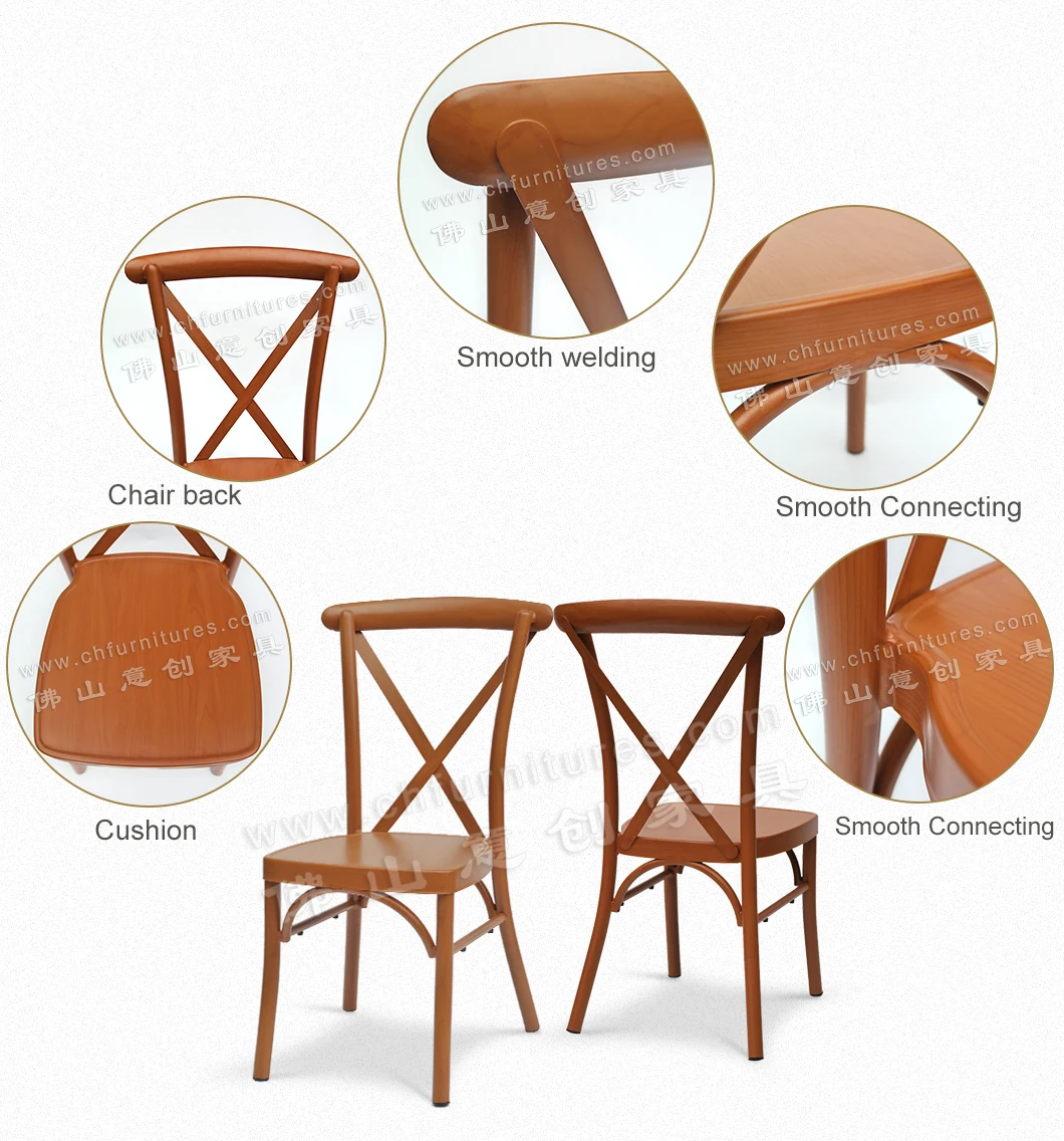 Outdoor aluminum wooden grain finish dinning restaurant x cross back wedding chairs for rental