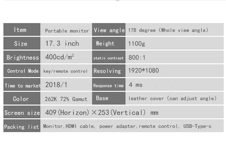 17.3 portable monitor technical parameter | ||