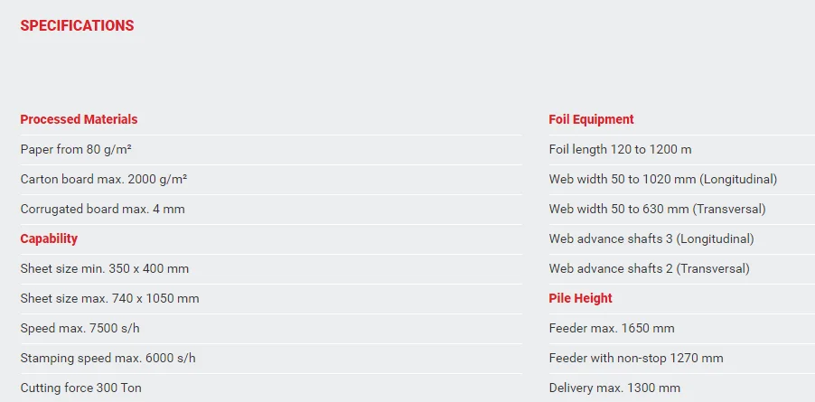 TECHNOFOIL 1050-FSC Automatic Platen Hot Foil Stamper & Die Cutting Machine. It can run large format die-cutting with stripping as well as stamping with 3 longitudinal and 2 transverse foil pull system. High precision, high speed, easy to operate, quick make-readies, durability and stable performance. Features that make the machine one of the best options when choosing.