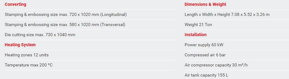 4. Foil stamping system * Heating system in 12 temperature zones with individual temperature control. * Foil break detector. * Films fasten device. * Foil unwind device. * Honeycomb chase.