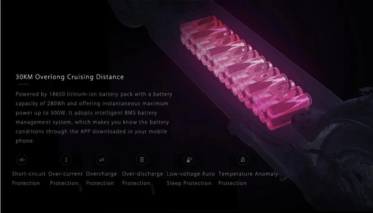 - Powered by 18650 lithium-ion battery pack with a battery capacity of 280Wh and offering an overlong cruising distance of 30km