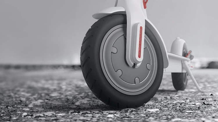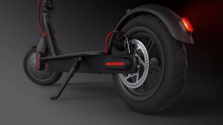 - The electric scooter comes with a dual-brake system. The front wheel has E-ABS anti-lock system, while the rear wheel uses mechanical disk brake. The braking distance can be shortened to 4 meters, making your riding much safer