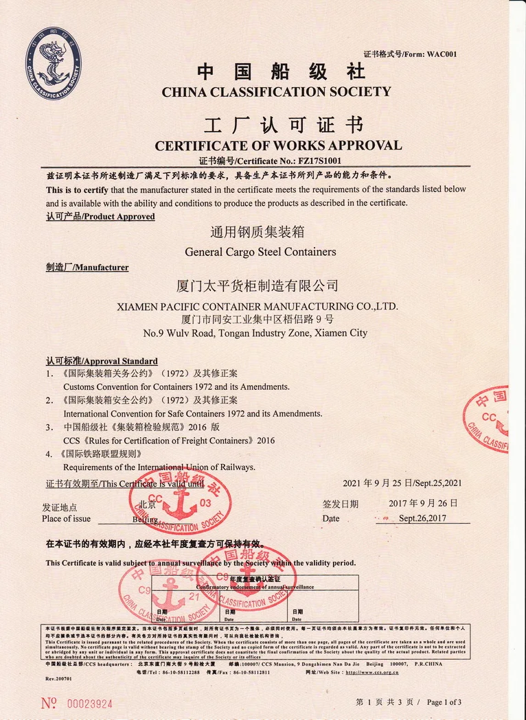 The shipping containers are made of corten steel and are able to withstand extreme tempreture ranging from -40 °c to 70°c, and all have been certified by major Classification Society(CCS) completely conforming to International Standard.