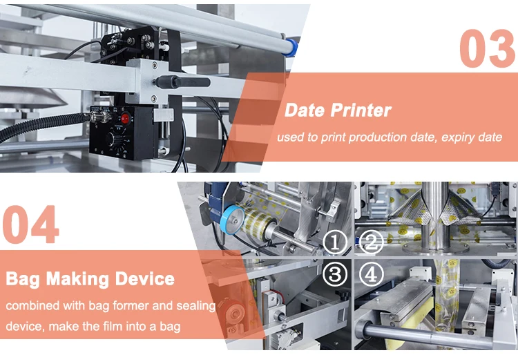 1. Efficient: Bag - making, filling, sealing, cutting, heating, date / lot number achieved in one time;