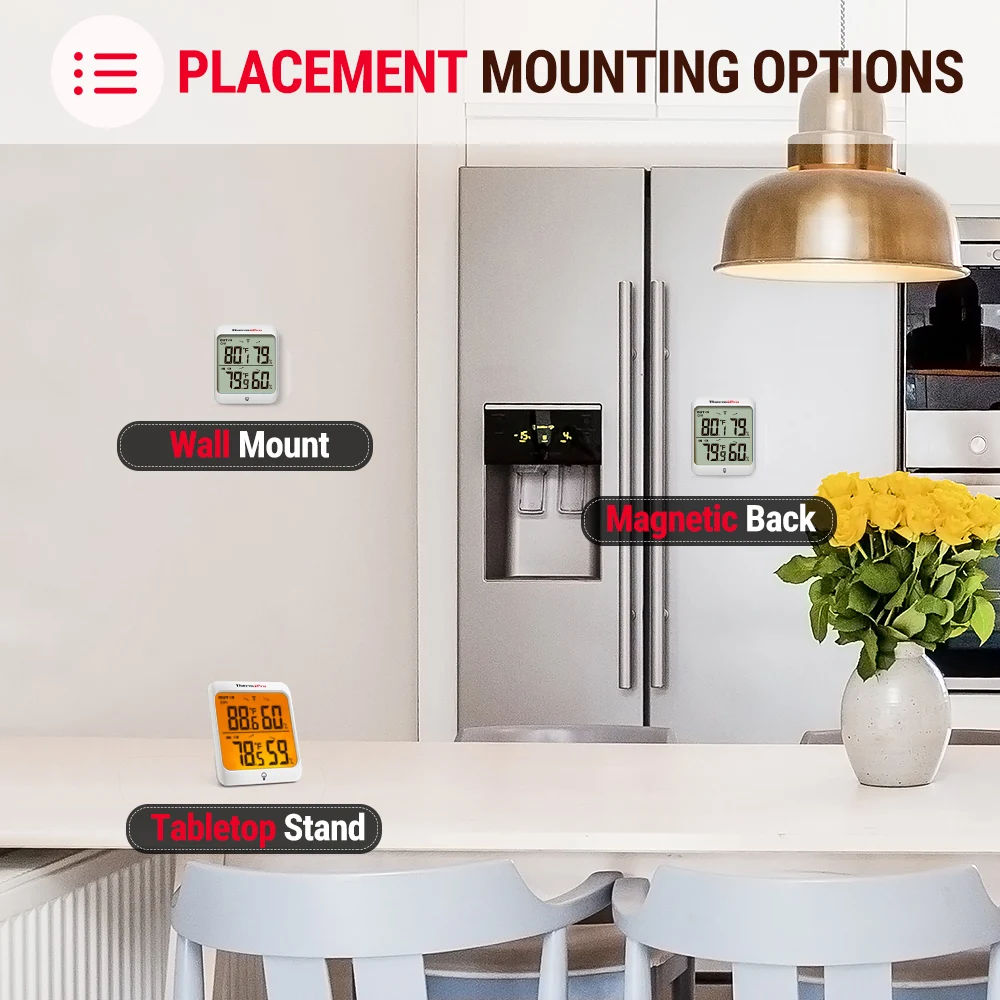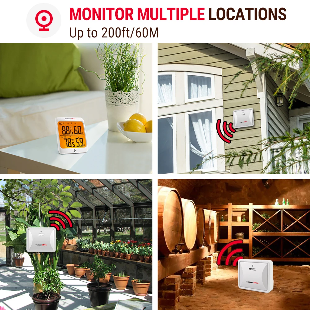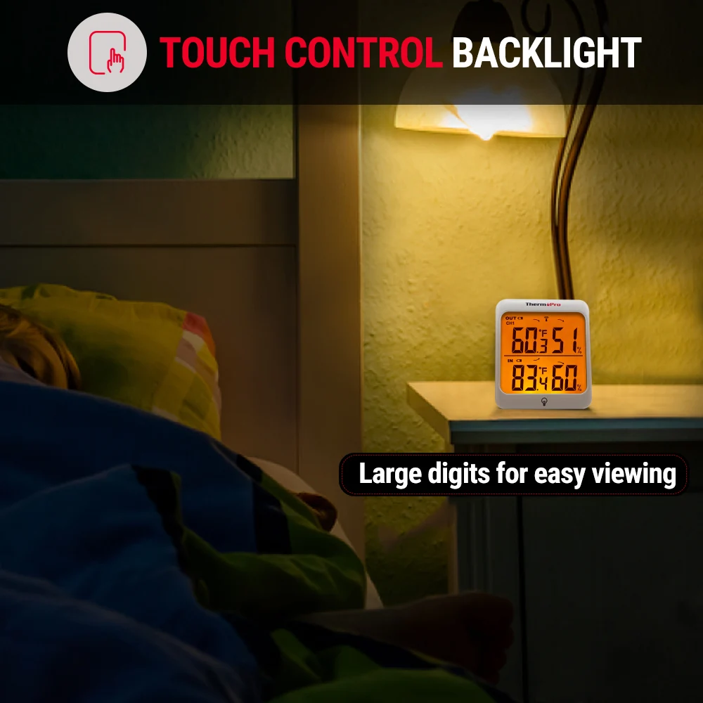 Equipped with professional grade rechargeable sensors, ThermoPro TP63A inside outside thermometer wireless provides accurate indoor outdoor temperature and humidity readings every 50 seconds up to 200ft/60m away, allowing you to be aware if adjustments are necessary for your household! No matter the situation, the wireless thermometer hygrometer with a backlight and touchable screen tells you what you need to know, at-a-glance, all in an attractive, compact digital display.