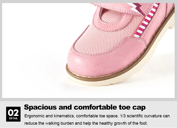 Ergonomic and kinematics, comfortable toe space. 1/3 scientific curvature can reduce the walking burden and help the healthy growth of the foot.
