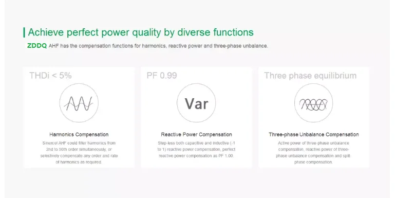 ZD-AMS active power filter(APF/AHF for short) is a perfect comprehensive solution to power quality problems with power grid such as harmonic wave(can filter 2nd to 50th harmonic interference completely), reactive power, and 3 phase load unbalance.APF is connected in parallel in power grid, to detect the harmonic wave in power grid in real time, generate the reverse-phase compensation current through the converter, and dynamically filter the harmonic wave in power grid. The operation of APF is unaffected by power grid structure and load type, and it will not produce harmonic oscillation with the system, thus perfectly realizing harmonic wave control of various loads. APF can also realize dynamic reactive compensation, and control the capacitor switching, to improve the power factor of power grid. Meanwhile, APF has the function of controlling the 3 phase load current unbalance, thus comprehensively solving various power quality problems with power grid.