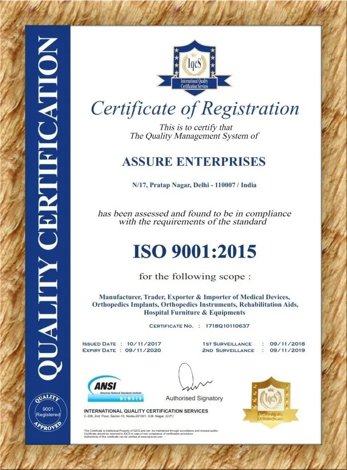 We are Assure Enterprises engaged in the manufacturing and export of high class Orthopedic Implants and Orthopedic Instruments. For several years, we have been supplying quality goods at competitive prices to various Medical Institutions, International Export etc. We are holding all quality certificates like ISO:13485, GMP, CE.