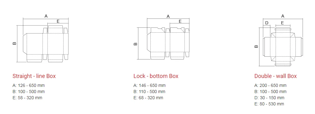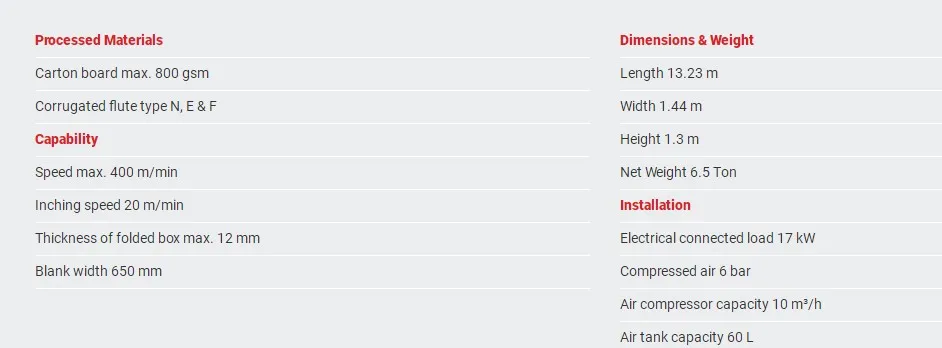 * Upper and lower drive mechanism for lengthwise adjustment. * Equipped with automatic belt tension-adjusting system. * Continuous and automatic box collection mechanism that ensures a neat transfer to the Press section, guaranteeing a well aligned flow.