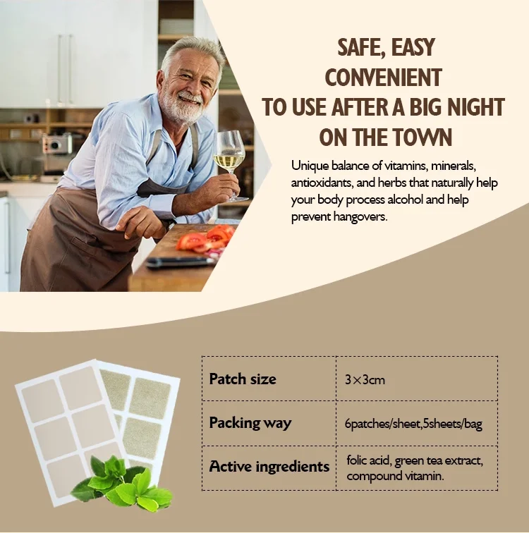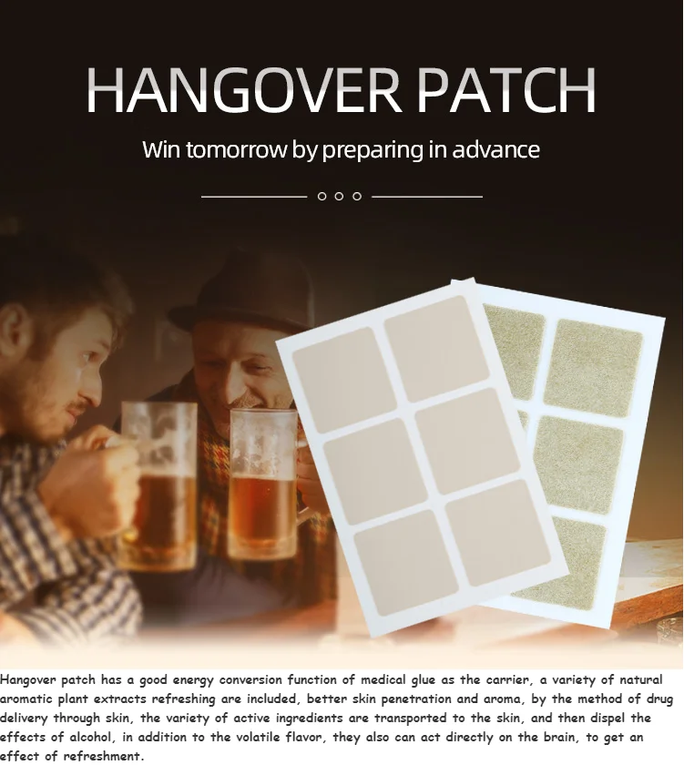1.Q:Could you offer low MOQ of the Hot sale relieve drunk hangover patch? A:Yes,Pls send email to us to check the quantity of Vitamin B hangover patch.