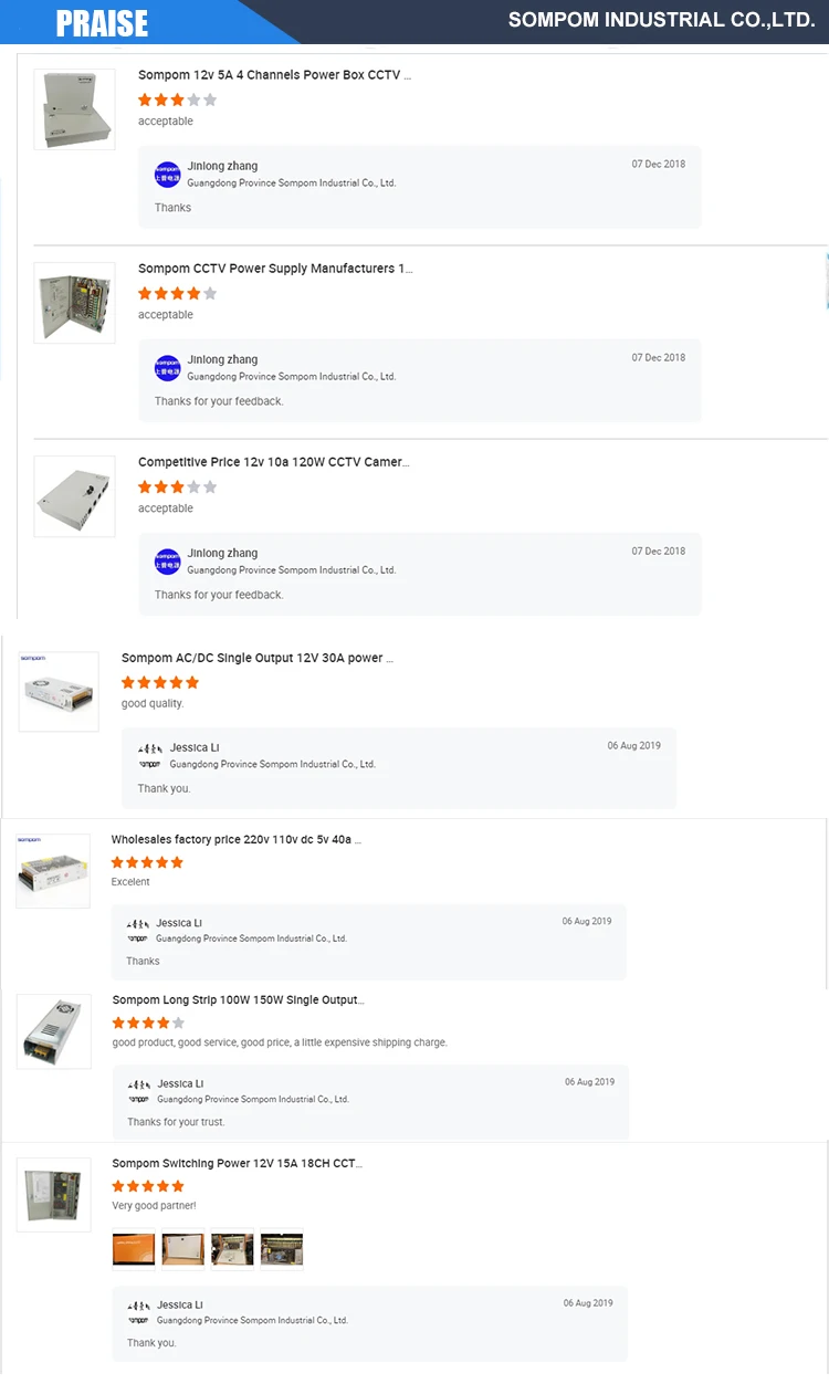 SOMPOM is focusing on offering LED switch power, waterproof switch power,rainproof switch power,AC-DC power adapter and CCTV camera power. Withe the over load protection, over voltage protection and high temperature protection. SOMPOM wins customer’s favor by its high efficiency, reliability and long life span. Each of the switch power is extremely safe and stable after 5 times testing. All of our powers have the ISO9001,CE,FC,ROHS certification. Our switch powers are widely used in industrial automation field, indoor and outdoor LED lighting, LED lighting engineering.