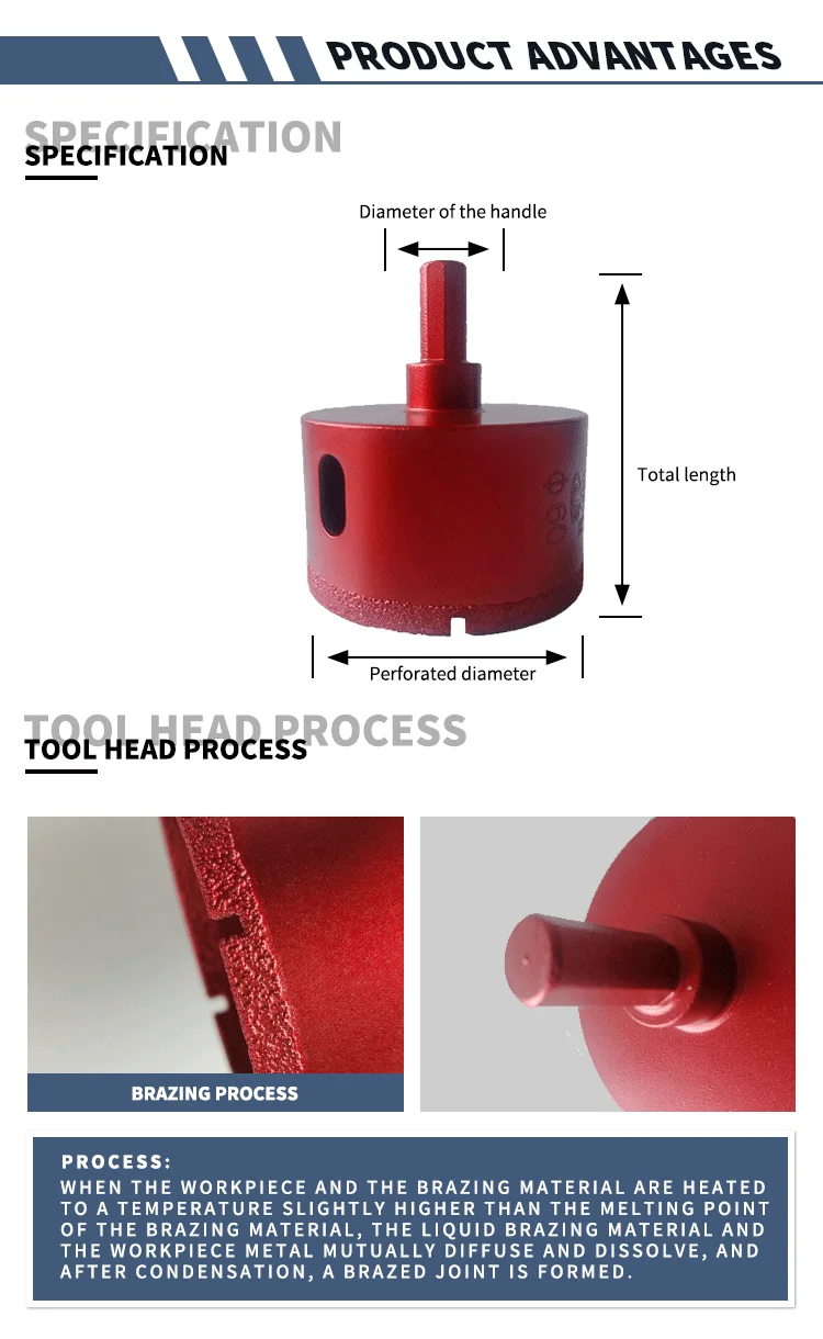 Features: | 1. Very high diamond concentration gives maximum footage and drilling speed in all types of drilling applications. 2. sintered process allow bits to cut without water and ensured a longer life. 3. Use water to cool down the bit while drilling is highly recommended to extend the lifetime if the bits. 4. Suitable for Granite, marble, concrete, etc. 5. Ideal for both professional contractors and DIY users. | ||||||