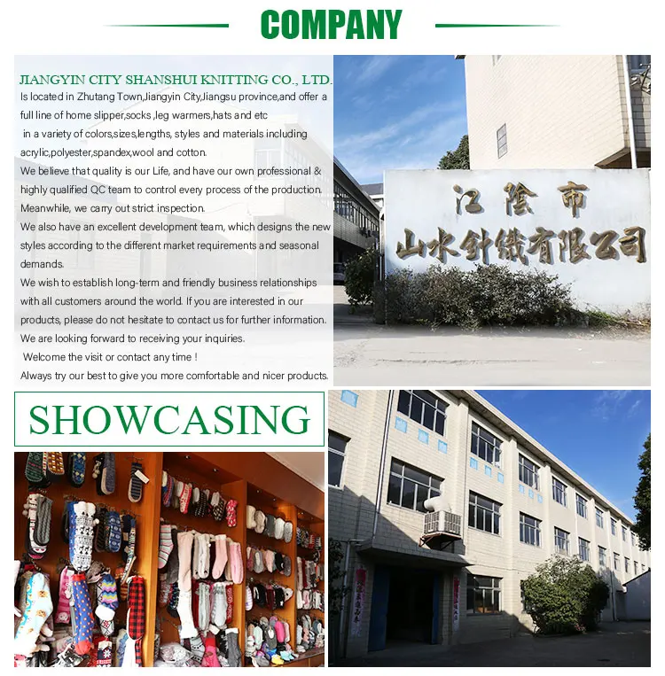 Our company was established in Jiangyin Jiangsu in March 2005. There are many well-experenced workers in our company, specializing in producing high qulity knit goods: socks, room socks, indoor slipper,home shoes etc. Our products with good qulity and competetive prices are sold very well in domestic and abroad markets and won a good reputation. We can provide top services for all our clients from home and abroad. Warmly welcome you to come and cooperate with us for mutual benefits and further development.