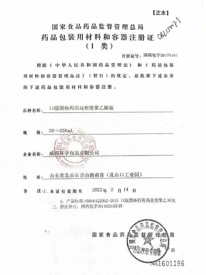 Weihai Huanyu Packaging Co. Ltd owns more than 100 sets of various type auto machines and 5000 square meters of 10lac-grade clean workshop. Its annual production capacity for PE, PET, and PP plastic bottles reached 1.5 billion sets.