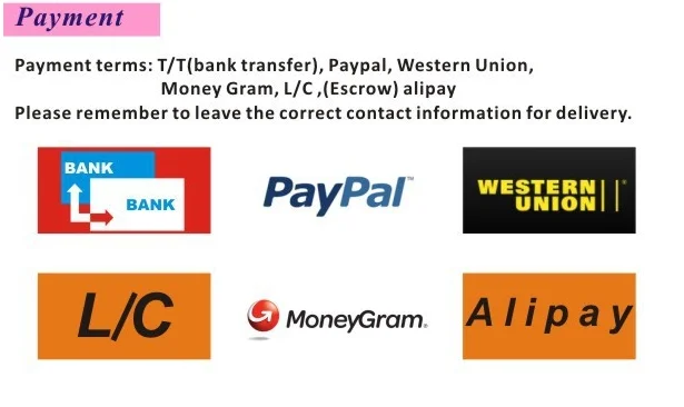 1.Shipping method: by air or by sea. 2.International express: DHL, TNT, UPS, EMS, ARAMEX, Local line 3.Shipping terms: EXW, FOB, CFR, CIF. 5.Payment terms: T/T, Paypal, Escrow, L/C, Western Union.