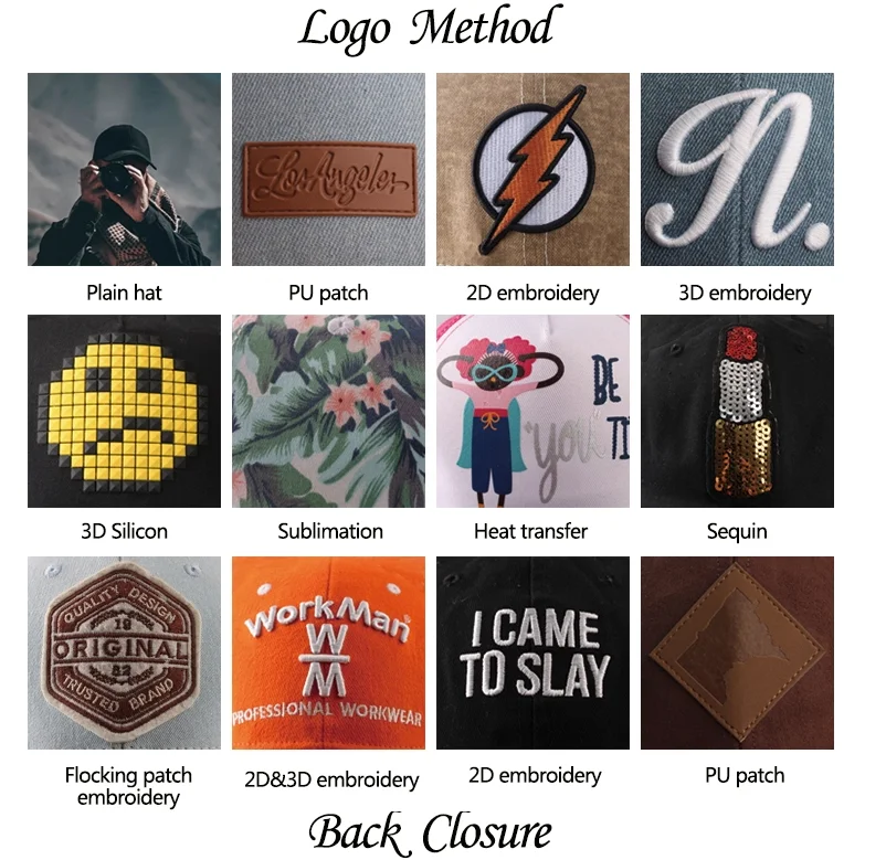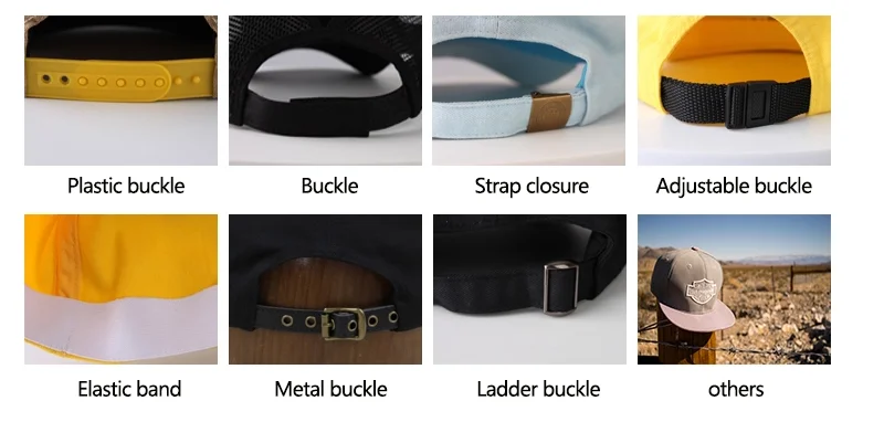 4.Back Closure | snapback closure | Brass, Plastic,Metal buckle, elastic.And any kind of back strap closure | |||
