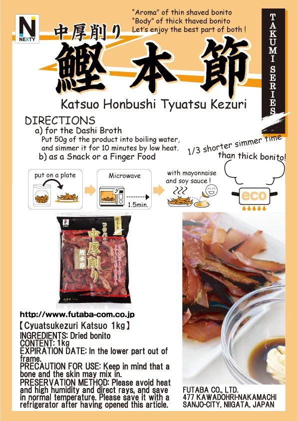 This product is carefully manufactured to the 0.5mm thickness shaved bonito by our traditional technique. For all Japanese Noodle Soup! The Traditional Shaved Bonito but this is new. Comparing to the Atsukezuri, the thickest shaved bonito... Beautiful aroma of thin shaved bonito. Strong body of thick thaved bonito. 1/3 cooking time ! Energy Reduction ! 10% UP soup amount ! Let’s enjoy the best part of both !