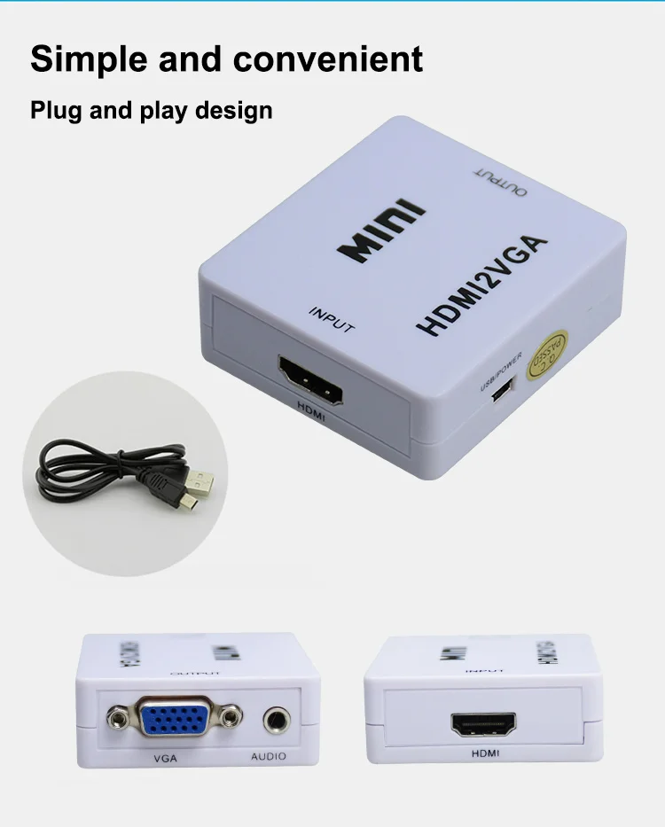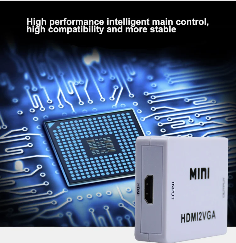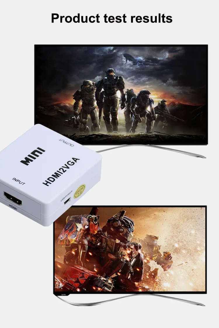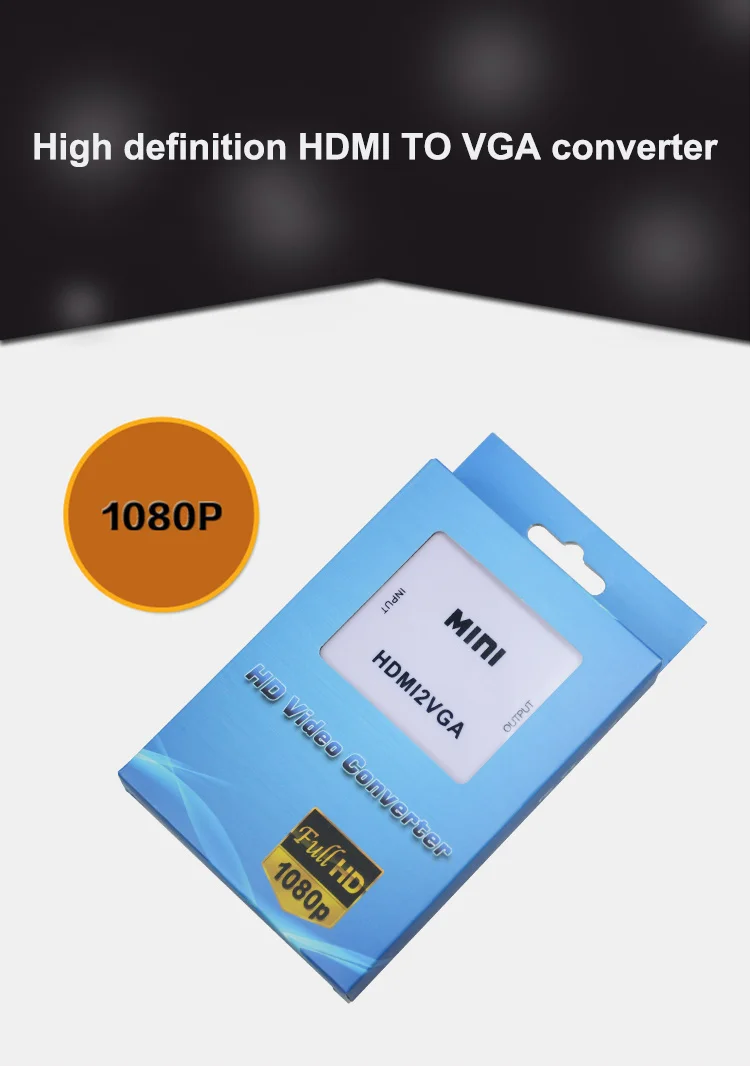 1.The MINI HDMI2VGA is a high-definition video converter which convert HDMI digital signal to VGA analog signal and analog audio signal. | ||||||||