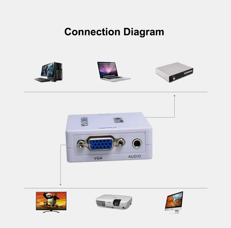 The Mini Media to VGA is a high definition video converter, which converts the HDMI digital signal to analog VGA signal and analog audio signal. HDMI connection signals For PS3 XBOX 360, Blue-ray DVD, HD set-top boxes, CRT / LED Display etc. You can watch ALTA DEFINICIÓN Video on your regular TV without HDMI Interface.