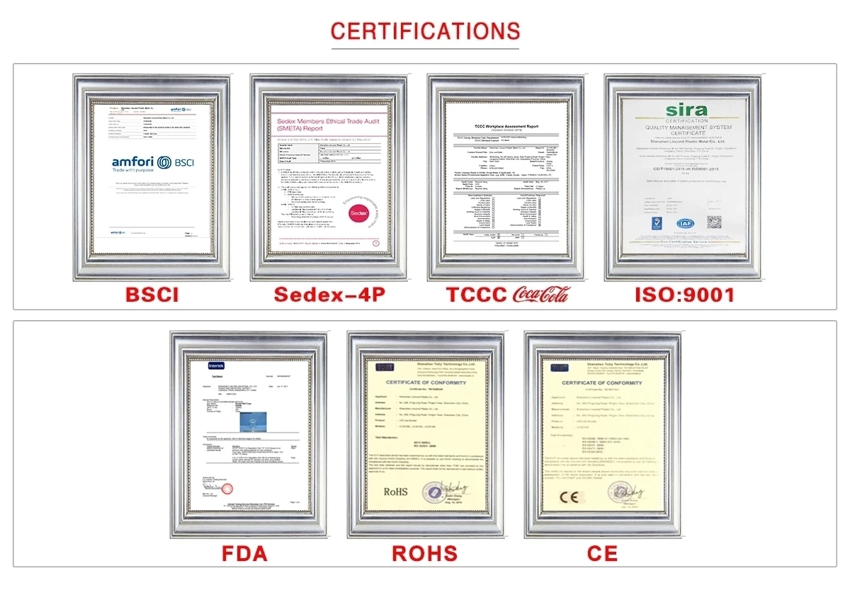 Certification | FDA, CE, ROHS, BSCI, SEDEX-4P,TCCCCoca-cola,ISO:9001 | ||||||