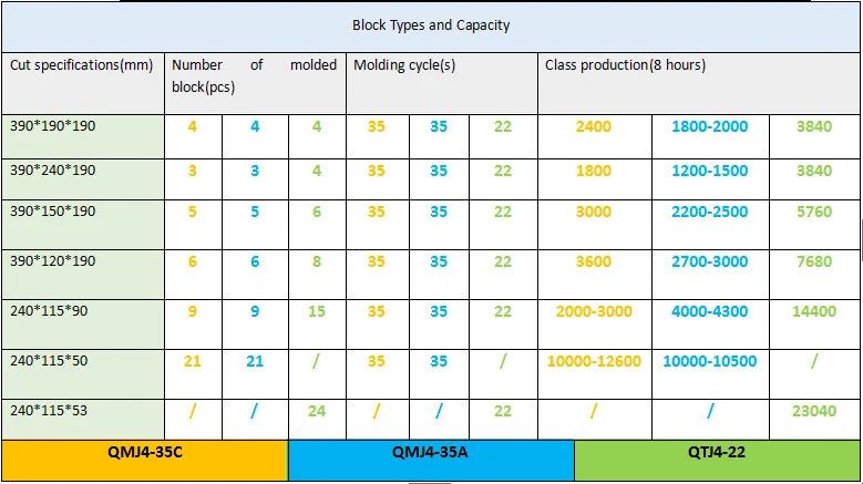 Block size(mm) | Number of molded block(pcs) | Molding cycle(s) | Output(8h) |
