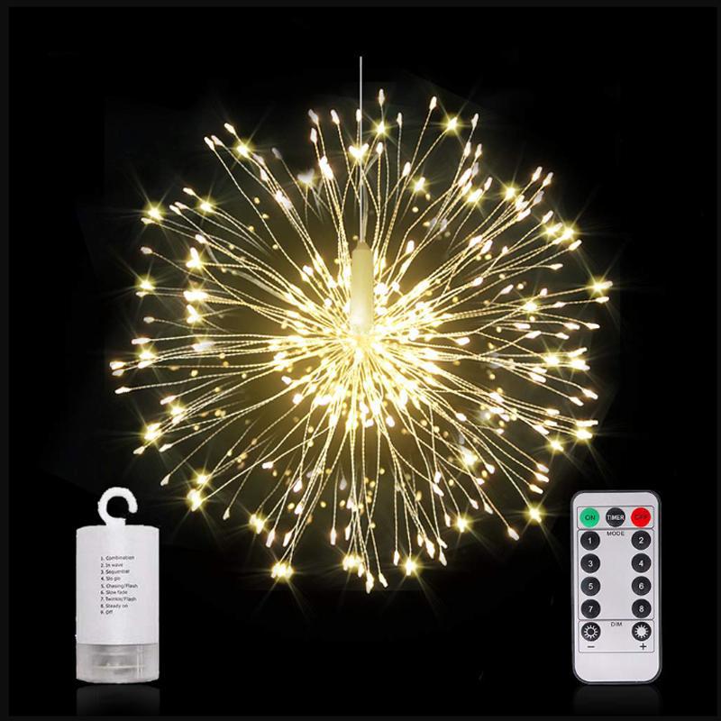 Decorative Hanging LightsDecorate your corridor, courtyard, garden, bar and windows, any celebrating occasions with these amazing fairy lights, create a festive and romantic atmosphere. Perfect decorative lights, led fairy string lights, led christmas lights, party lights. | Outdoor string lightsThe firework lights with hooks on it and hanging wire up to 35in. Can be hung anywhere without restriction. Perfect use for garden, patio, corridors, Christmas trees hanging lights, living room, bedroom, tent, wedding, parties, etc. | Timed Fairy LightsTo avoid forgetting to turn off the battery operated fairy lights, you can set timer by pressing the TIMER button, the battery fairy lights will be 6 hours on and 18 hours off per day |