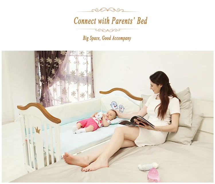 A versatile 5 in 1 solid wood crib, it provides a safe and sturdy track that is both environmentally friendly and durable.It is the perfect choice for a small space that can be moved easily or rocked to make your baby fall asleep faster. Once your child grows up, the crib can be disassembled into study table.The crib passed the test report.