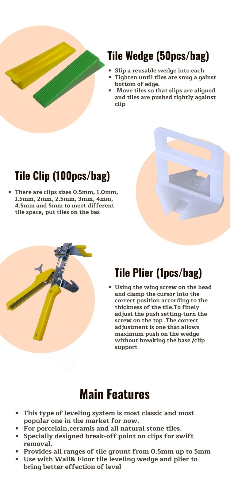 Application | Ensuring the proper leveling of tiles and helps speed the tile setting process |
