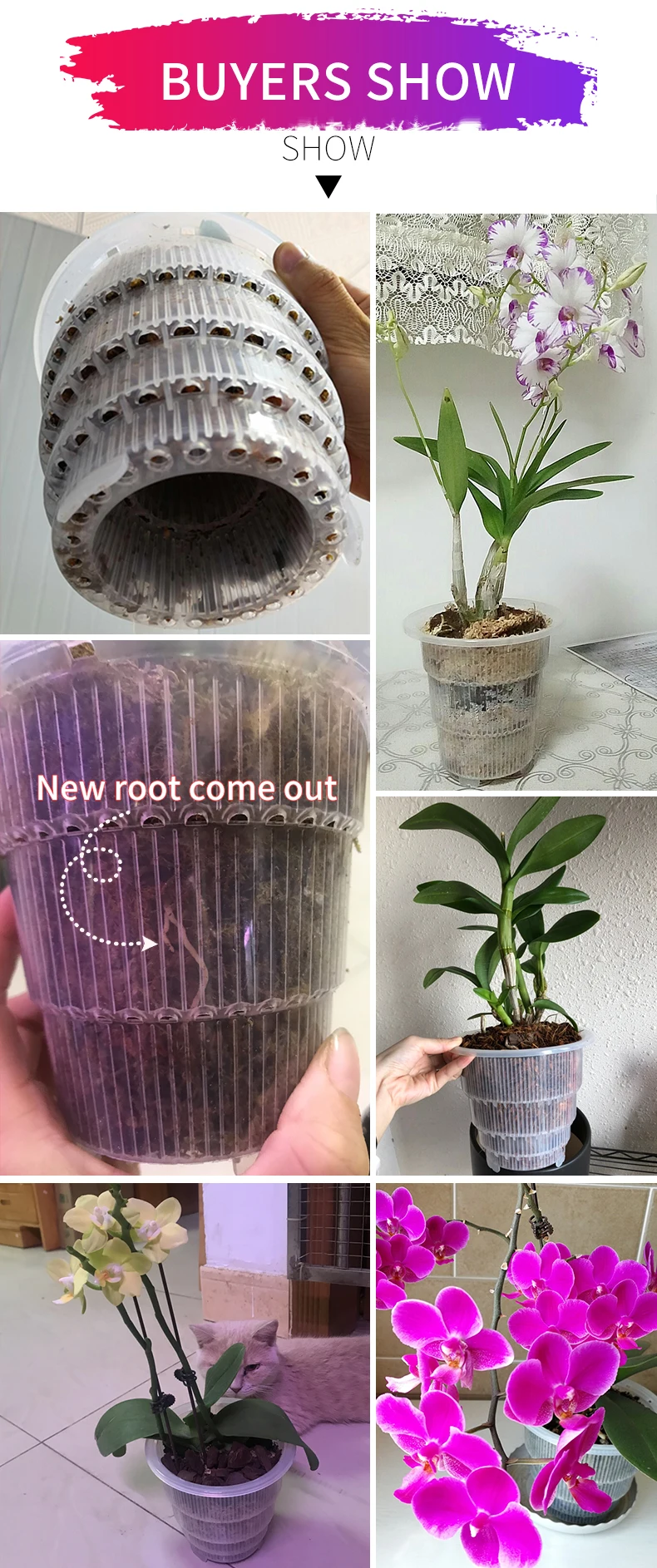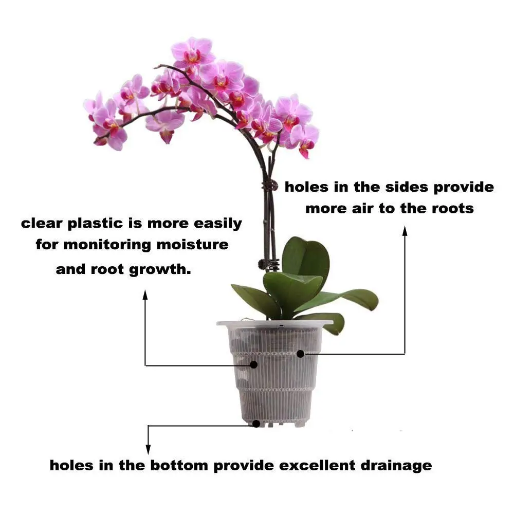 * Patent Slots that Guides Root Growth -- When orchids become too big for a solid pot,roots begin to circle and choke each other,but Meshpot Patent Slots,can guide the root to grow vertically downwards out of the vents at the sides and bottom,prevent rotting and circling,prunes root structure,promote root growth.