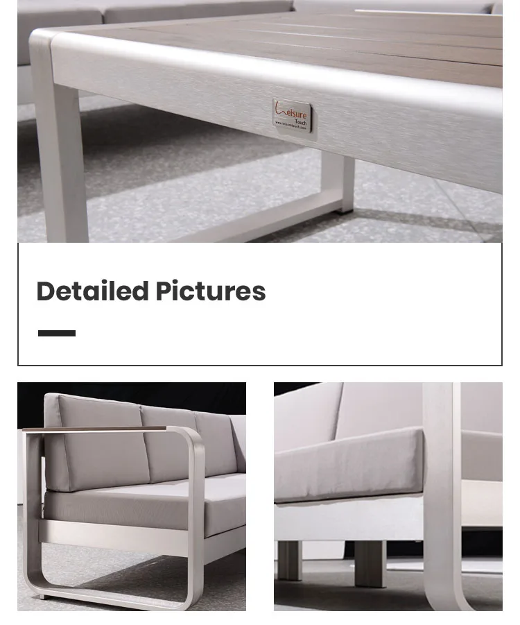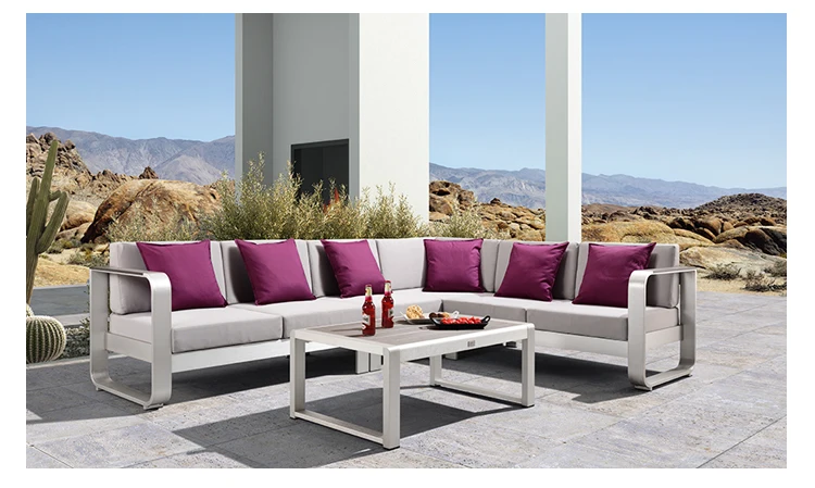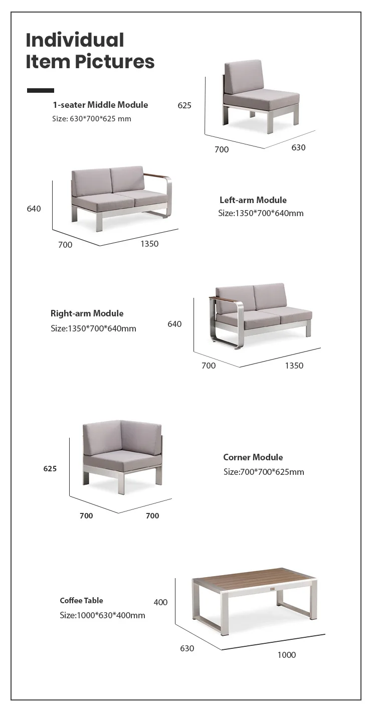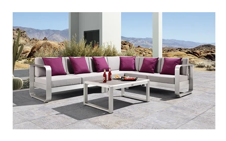 The frames of this Fairy garden set are manufactured entirely in coolness aluminium, with brushed finish. This set will bring you unrivalled comfort, while also offering a sleek, modern design.This set has 5 modular pieces. It is made up of a modular corner sofa and an aluminium coffee table. It is a lightweight, resistant material that does not rust by nature. The coffee table comes with a 15mm plastic wood . The cushions, on the other hand, are all water repellent and have zipped covers for easy removal, With thick, padded backrests, it provides all the comfort of an indoor sofa.