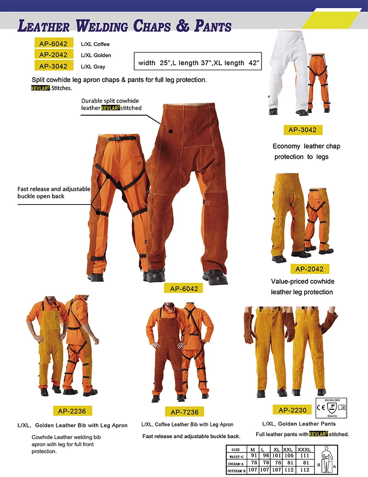 Feature | These pants carry a state of art design and has set the industry standard. * Superior flame, heat and abrasion resistant, select cowhide leather for heavy-duty protection; * Velcro closure front minimizes hot shooting spatter from entering; * Tool pocket with cap for safety and convenience; * All seams double stitches with DuPont Kevlar ® for added durability. |