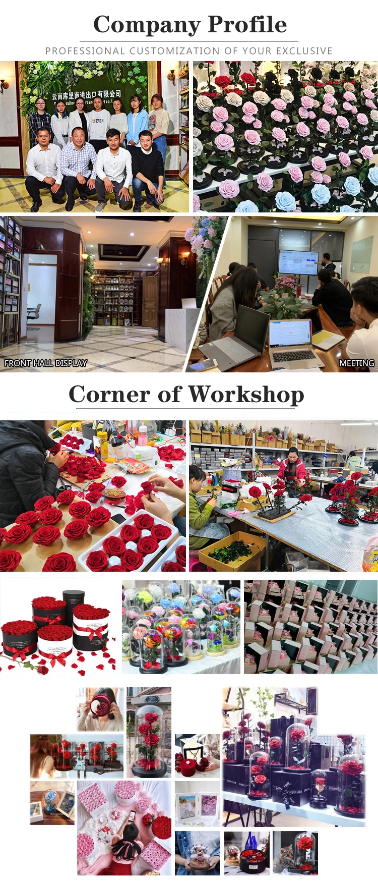 Kunming is a largest flower growing base, We have over 200 acres planting base, planting roses, hydrangea, carnations, rabbitstail grass and other flower materials, variety! So that we can provide high quality flower materials to make best preservedflowers. Our company is a comprehensive enterprise which research and development, produce,sells and exports preserved flowers,dryflower and crafts which made from preserved flowers . Our company is equipped with professional design team, we can research anddevelopment new products quickly and provide O E M and O D M service. Our company focus on customer’s satisfaction. We willstrictly control every production process,and we have professional QC to ensure product quality and professional foreign tradepersonnel to provide quality service. We warmly welcome friends from all over the world to communicate with us and learn from eachother.