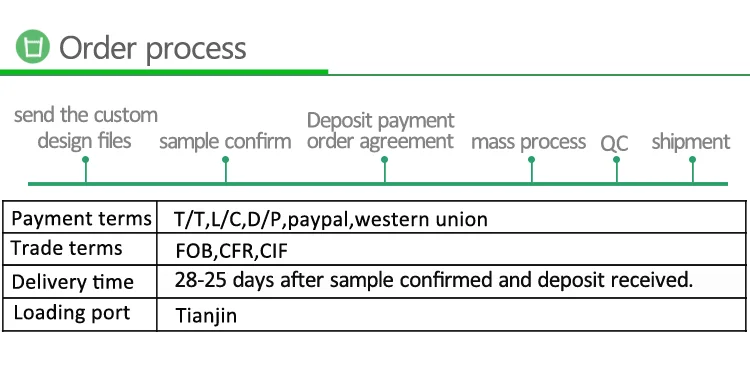 Q2. How do you ship the goods and how long does it take for production? A: For samples usually ship by express like UPS, TNT etc. For batch order, shipping by air or by sea are both ok. The delivery time is about 20days. If your order is urgent, we can ship within 15-20days