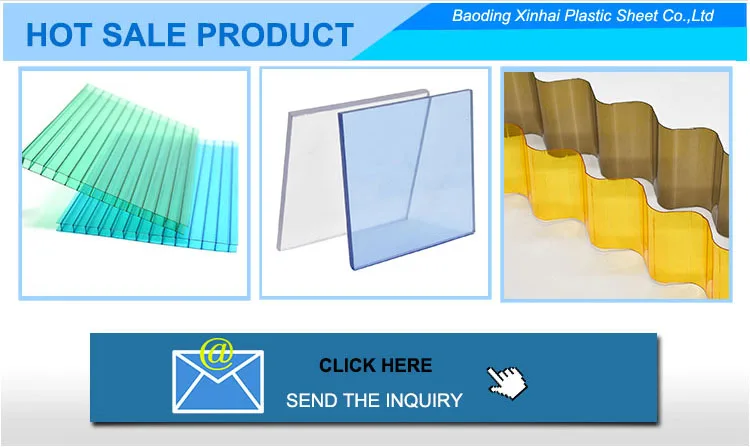 Baoding Xinhai Plastic Sheet Factory,As an Iso 9001:2008 certificated enterprise, specialized in develop and sales of hollow polycarbonate sheet,solid polycarbonate sheet and corrugated polycarbonate sheet and related pc accessories.After years development,XINHAI has established mature sales and agency network.Xinhai PC sheet runs in more than 100 countries including USA,UK,Brazil,Chile,Mexico,Panama,