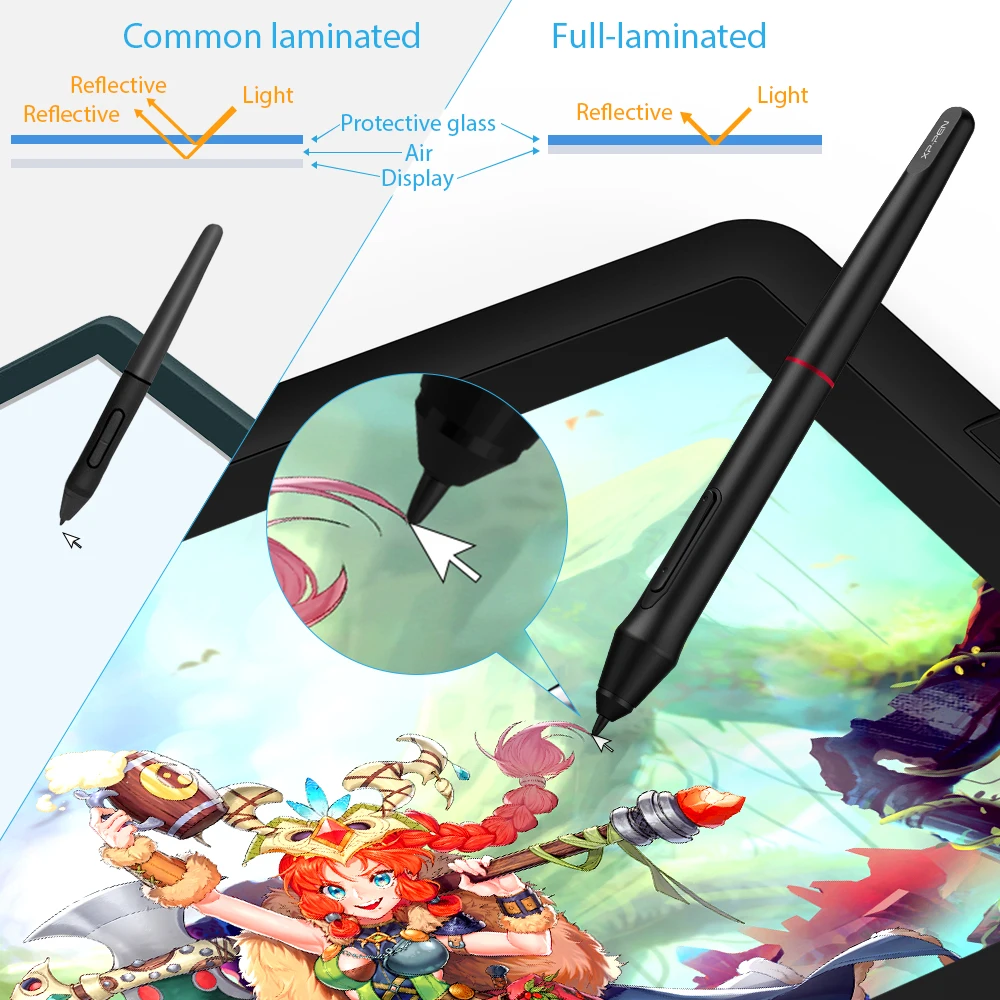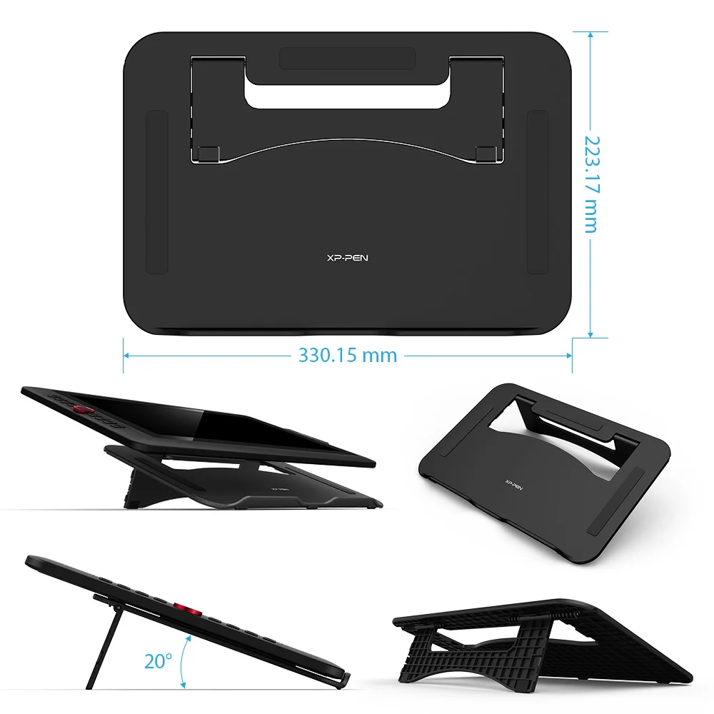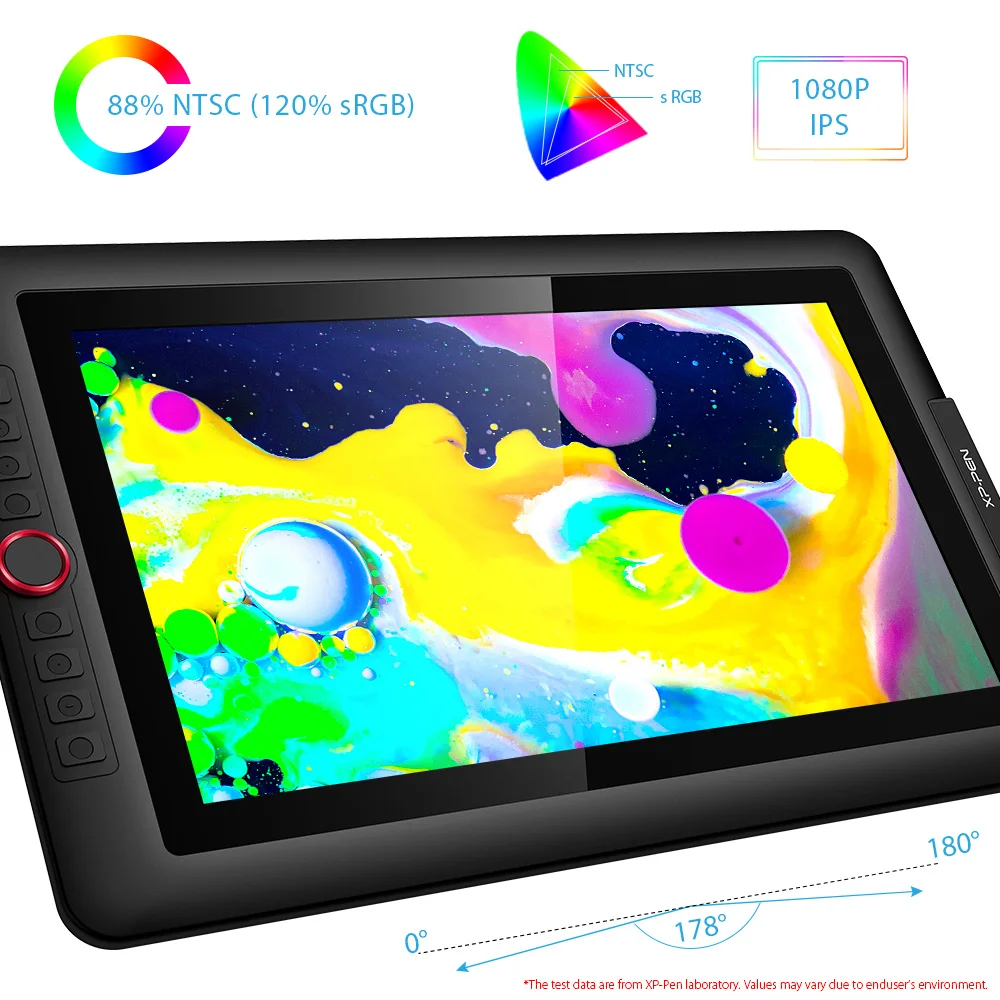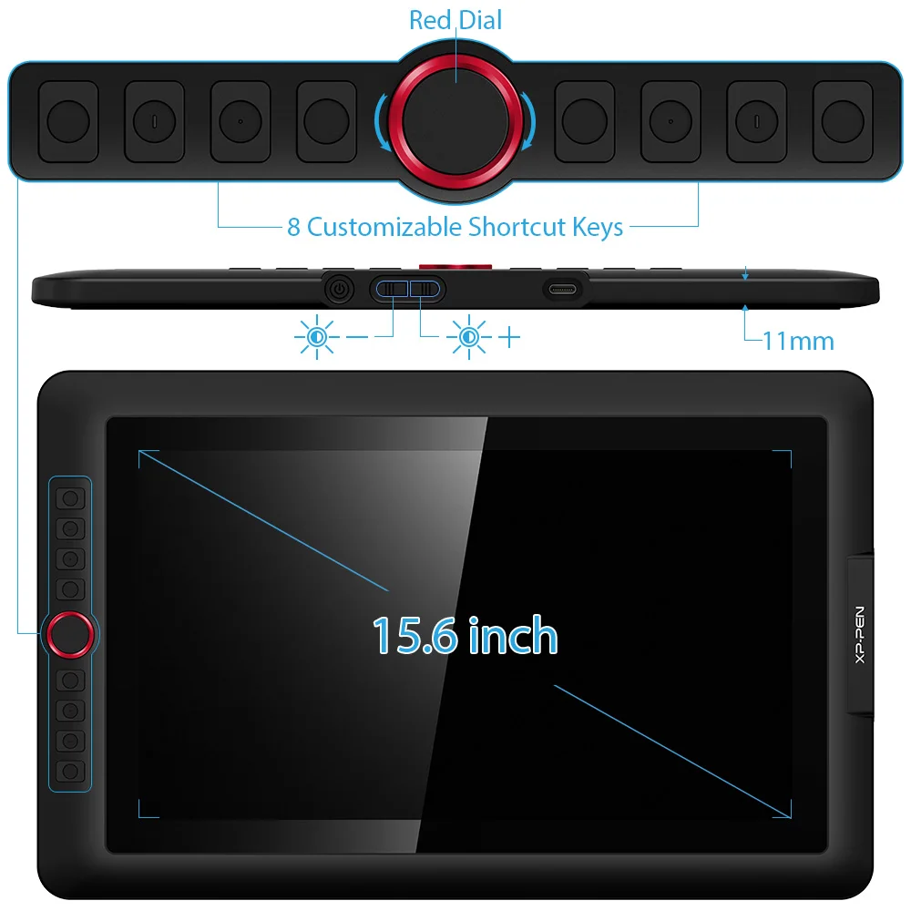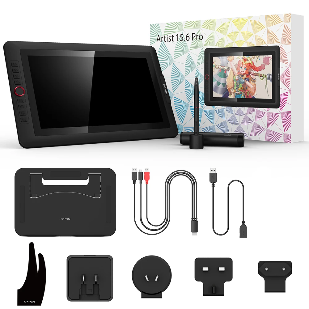 Artist 15.6 Pro | Product Dimension 443 x 280 x 12.6 mm Active Area 344.16 x 193.59 mm Thickness 11 mm(thinnest) Shortcut Keys 8 Roller Wheel 1 Pen P05R Battery-free Pen Pen Pressure 8192 levels Tilt 60 degrees Report Rate ≧200 RPS Display Resolution 1920 (H)*1080(V) pixels Display Color Gamut 88% NTSC, 120% sRGB Resolution 5080 LPI Visual Angle 178° Input Device USB Supply Voltage DC 5V Reading Height 10mm Accuracy 0.25mm(center) Color Black+Red Dial | 1 x Pen Display 1 x P05R Passive Pen 8 x Replacement Nibs 1 x Pen Holder 1x AC 41 Stand 1 x 3-in-1 Cable 1 x HDMI to Mac Adapter Cable 1x Extension Cord 1 x Quick Guide 1 x Drawing Glove 1 x Cleaning Cloth |