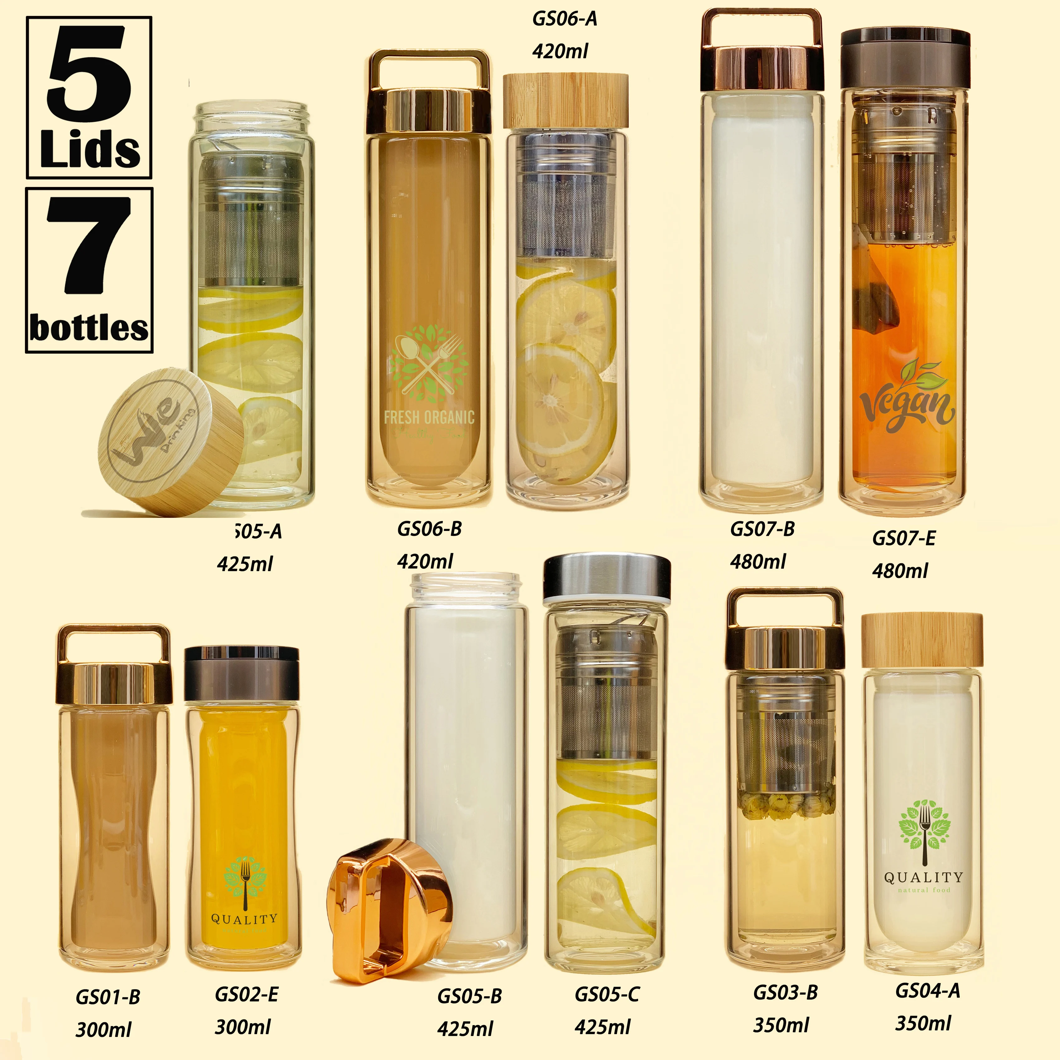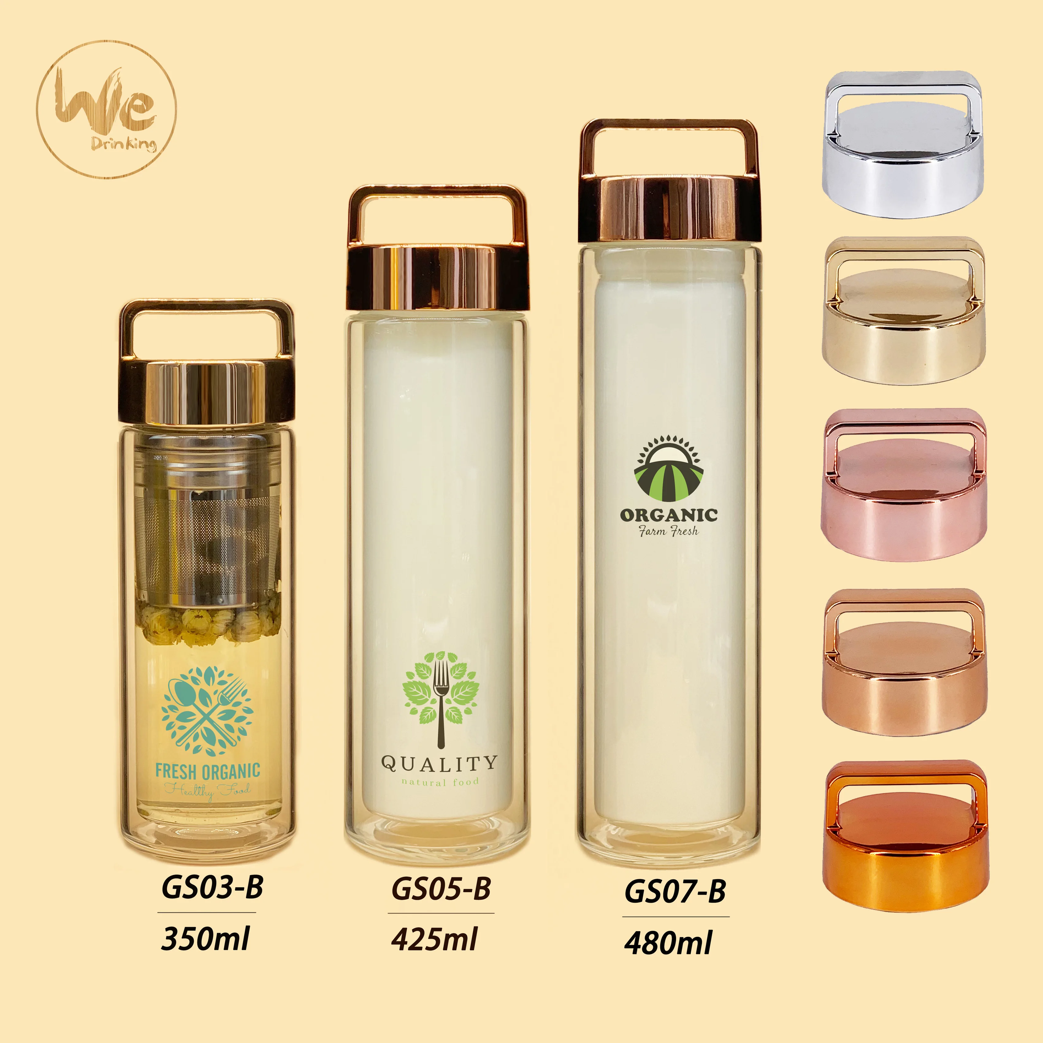 | WeDrinking: | 1)Customized logo a. Customized colour logo on glass b. Custimized laser engraved logo on bamboo/steel lid c. Embossed/laser engraved logo on inner steel of lid d. Customized logo engraved on tea infuser 2)Customized packaging a. White box(or with customized printed sticker),no MOQ and sticker free. b. Custimized colour box c. Customized colour tube/cylinder 3)Mix glass bottle body and lid you like Glass bottle: 7 different shape and height for coice Lid/Cap: 5 different lids for choice You can mix your ideal bottle easily. 4)More other accessories We can also provide customized sleeve,spoon,tea accessories,swing tag and so on. |