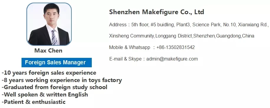 Shenzhen Makefigure Co., Ltd was established in 2010, we are OEM toy manufacturer which integrating R&D, design and manufacturing. Our main products include: Action figures, Cartoon/Anime Figures, Collectible Toys, PVC Figures, Vinyl Toy, Baby Dolls, Sports Give Away Toys, Electronic Toys, Souvenir Toys, Promotional Toys, 3D Plastic Key-Chains, Plastic Money-saving Box, Seasonal Gift Toys, etc. All our products comply with international toys safety standard, Non-Toxic, Phthalate free, passed En71-1-2-3, CE, ASTM,CPSIA.