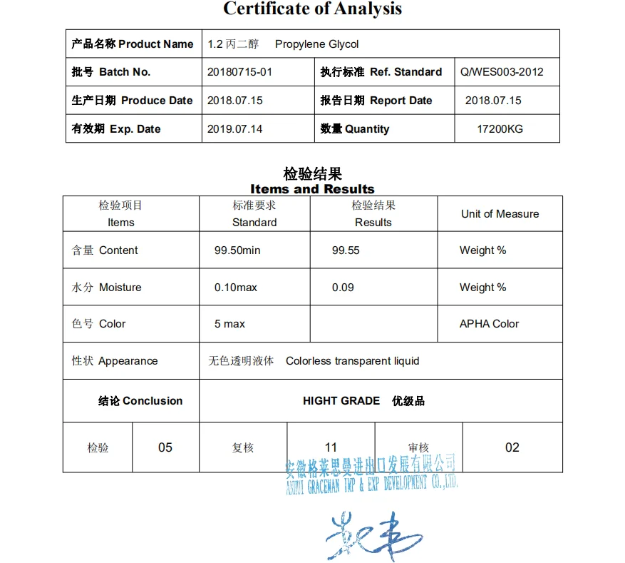 Propylene Glycol is the raw material for preparing unsaturated polyester resin, plasticizer, surface active agent, emulsifying agent and demulsifying agent. It can also be used as mould inhibitor, antiseptic for fruit, ice inhibitor and moisture preserving agent for tobacco.