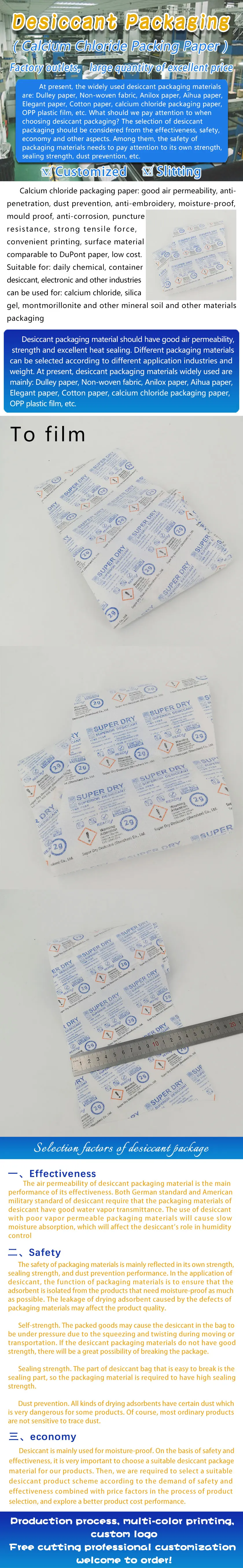 Calcium chloride packaging paper: good air permeability, anti-penetration, dust prevention, anti-embroidery, moisture-proof, mould proof, anti-corrosion, puncture resistance, strong tensile force, convenient printing, surface material comparable to DuPont paper, low cost. Suitable for: daily chemical, container desiccant, electronic and other industries can be used for: calcium chloride, silica gel, montmorillonite and other mineral soil and other materials packaging
