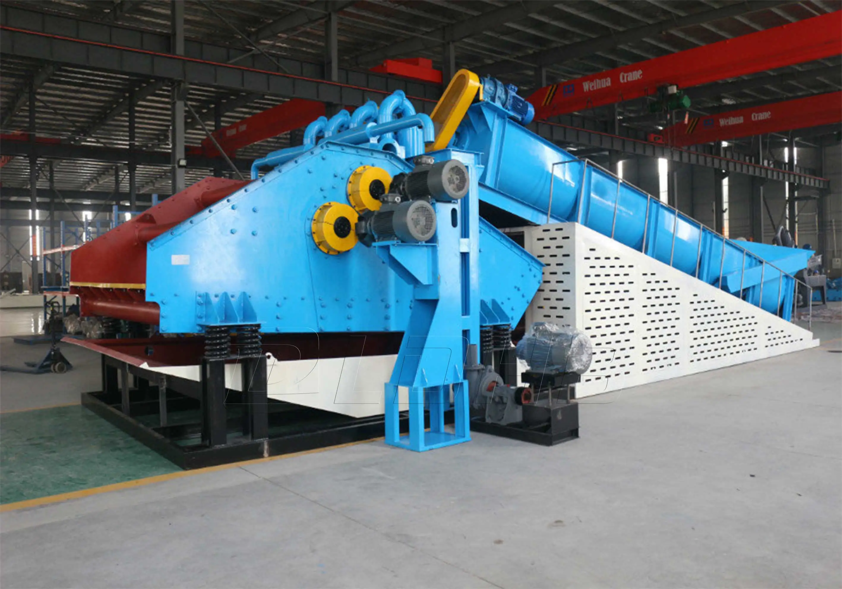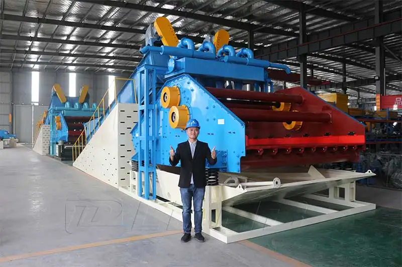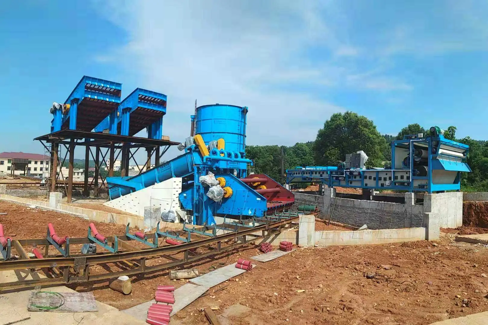 When the spiral sand washing machine is working, the crushing and grading materials are first passed through the conveyor belt to the double spiral sand washing device. After the grading and cleaning, the qualified material is dehydrated into the dewatering device, and the remaining waste water that after cleaning by the spiral sand washing device (containing a part of qualified material) is passed through the overflow device and get into the water reservoir device, then the waste water is pumped into the separation recovery device by slurry pump, material is concentrated under the action of centrifugal force, and the concentrated material get into the dehydrating device for dewatering.