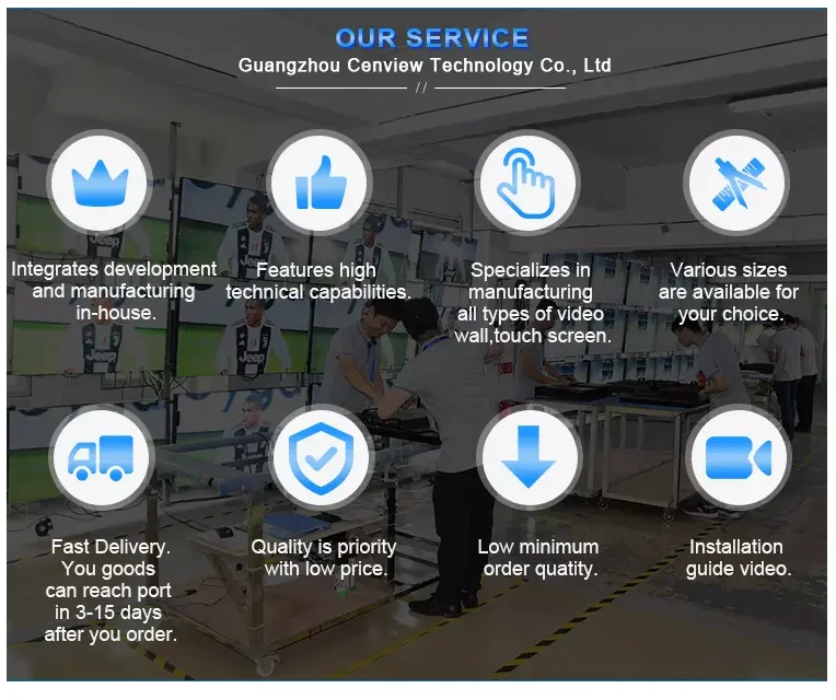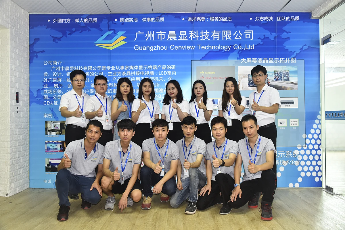 Guangzhou Cenview Technology Co.,Ltd.is located in Floor 3nd,Building H,Lianyi Indystrial Park,No.2,Anping Road,Panyu District,Guangzhou,Guangdong,China.Our factory has more than 600 square meters,standardized production workshop,professional technical staff and perfect service.Our company has been committed to improving technology,quality,and service.As a manufacturer and solution provider,Guangzhou Cenview Technology Co.,Ltd.engages inmultimedia display terminal product development,production,sales and service.We specialize in LCD video wall,touch screen kiosk,security system,monitor,digital signage.