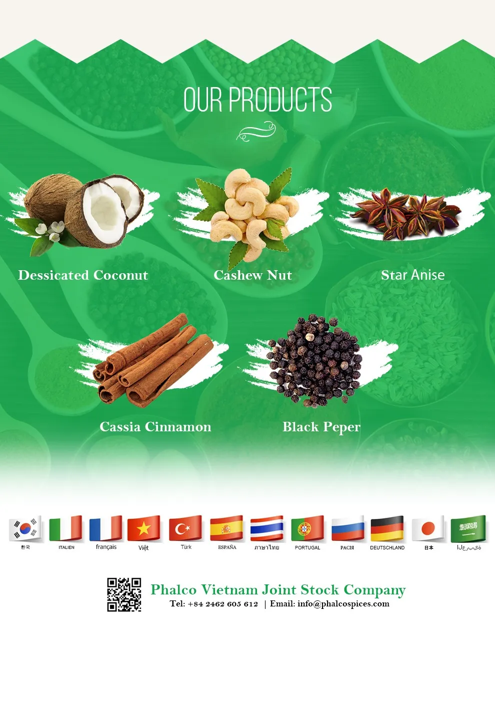 Phalco Spices Vietnam - one of the leading manufacturers of black pepper, cassia, star aniseed, cashew nut and coconut in Vietnam. We have satisfied customers from more than 60 countries all around the world like America, EU, Middle East, Asia countries...
