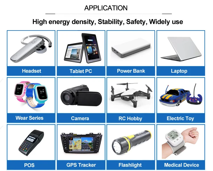 Mobile phones, tablets, headsets, smart watches and other smart wearable devices, GPS, electric toys, beauty instruments, aromatherapy machines, LED lights, quadcopters, drones ,etc.