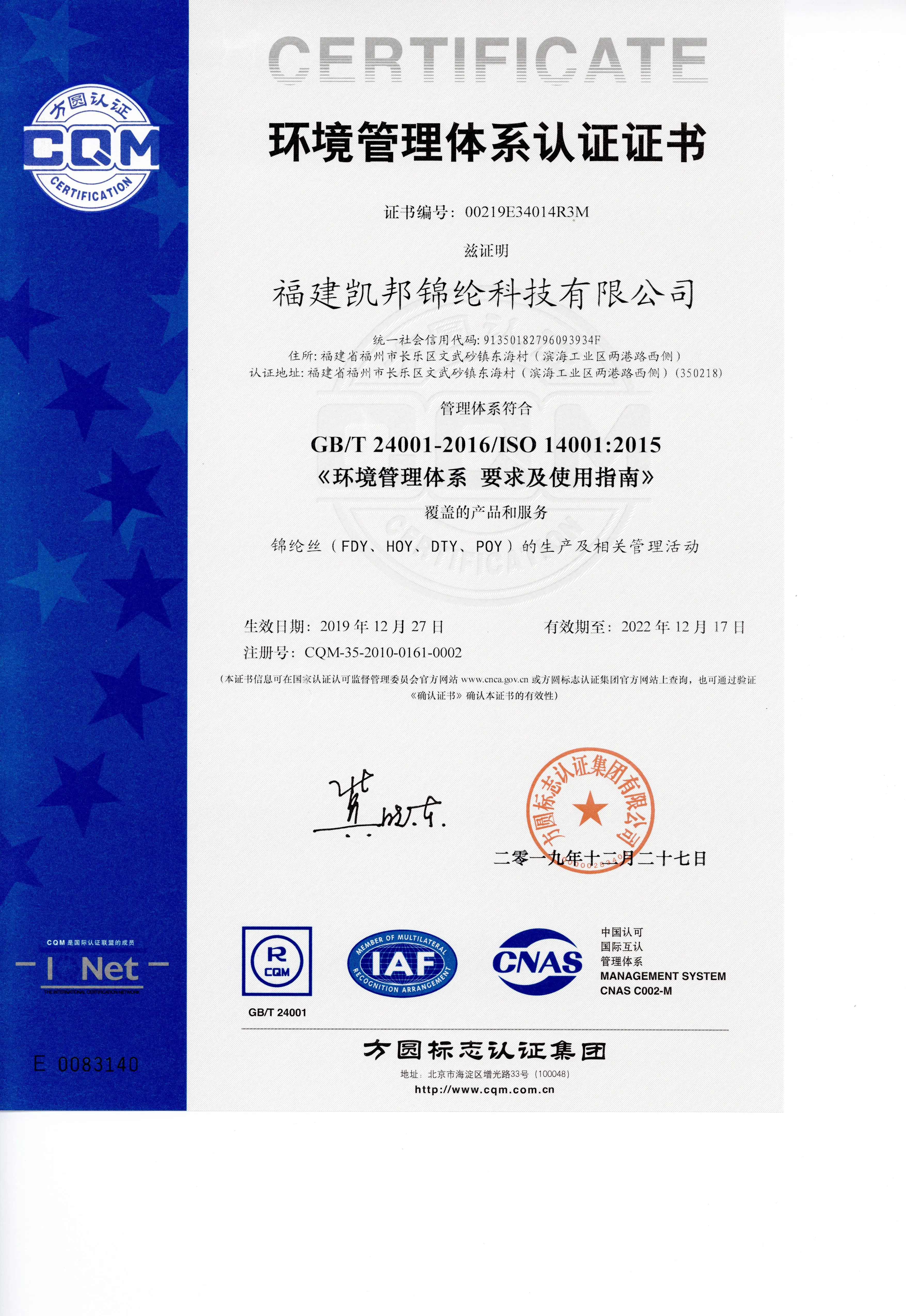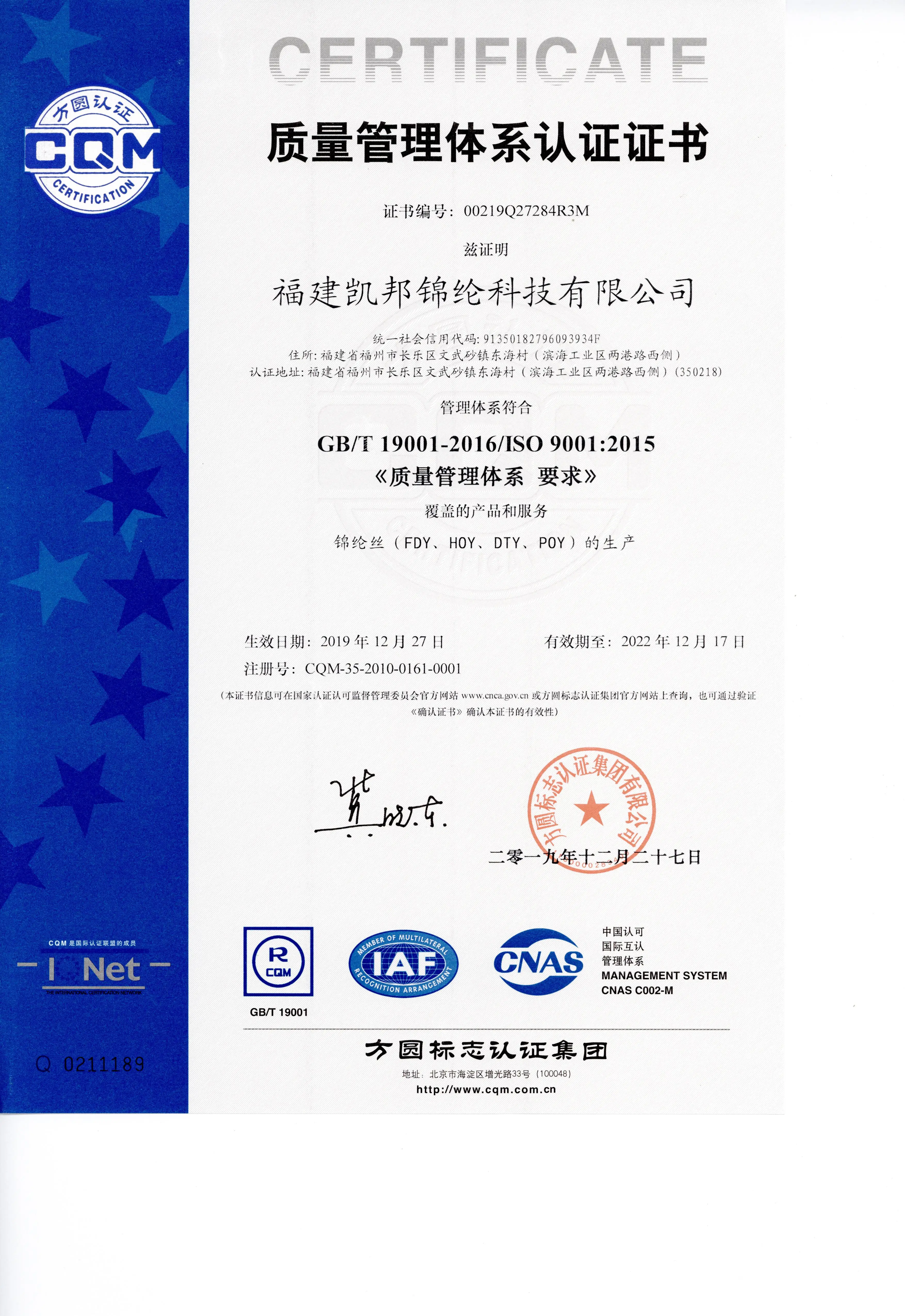 Fujian Kaibang Polyamide Technology Co.,Ltd. Was founded in October 2006 with a total investment of RMB 1.37 billion by Tangshan Donghai Iron and Steel (Group) Co.,Ltd which has solid industrial strength and capital operation capability and produces an annual output of RMB 5 billion . Therefore , it provides reliable financial guarantee for our company . Our company covers an area of appropriately 552 mu ( 1 mu =666.7 square meters ) and sits in beautiful Fujian Changle Binhai Industrial Zone, which occupies unique geographical location integrating inner harbor , outer harbor and airport , enjoying convenient transport , with location advantages in the textile industry. In 2015 we offer newest products- Dye Max Yarn after the collaborative research of our company and BASF chemicals company. In 2016 we offer Cationic Nylon 6 Filament Yarn. In 2017 we research Dope Dyed Color Yarn for Europe . Sales Area : China , India , Hong Kong , Philippines , Europe , South Korea , Indonesia , New Zealand , Turkey , Pakistan , Bangladesh , Egypt , Colombia and so on .