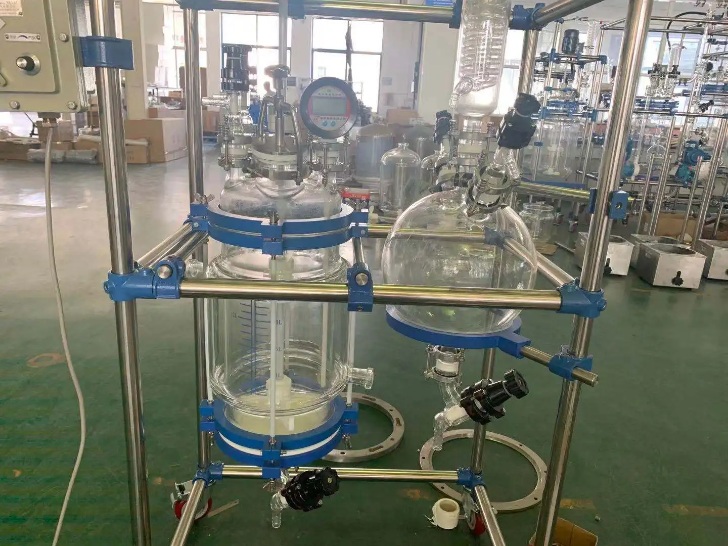 The standard jacketed glass reactor is made by 3.3 borosilicate glass ,and there are 2 layers. The reaction solvent can be put into inner layer for stirring reaction.The middle layer can be connected with different sources (water or oil) for cyclic heating or cooling reaction by heating and cooling circulator.Under the condition of constant temperature , the stirring reaction can be carried out under normal pressure or negative pressure according to the requirements. The glass reactor can also be used for reflux and distillation,which is an ideal experiment and production equipment for modern fine chemical plant, biological pharmacy and new material synthesis.