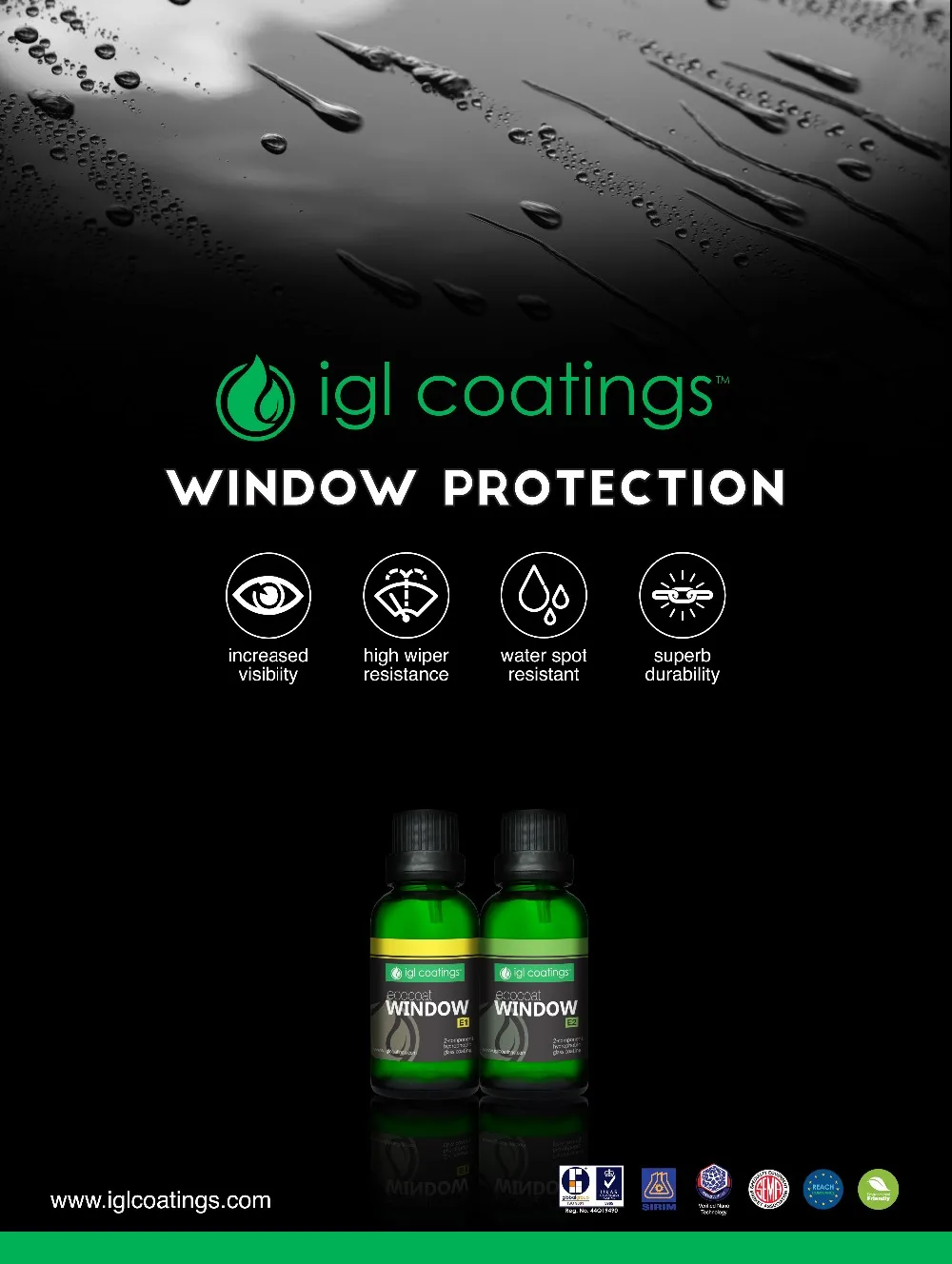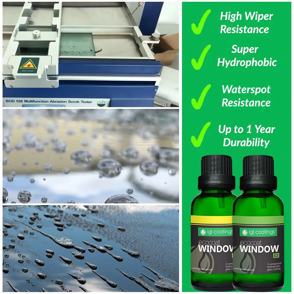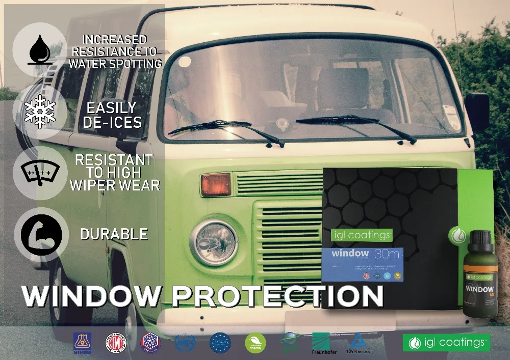 Ecocoat Window is a REACH compliant ceramic coating based on nanotechnology for all glass surfaces, glazed ceramics, smooth polycarbonates or plastics. It creates a super water repellent surface and prevents water spots and is resistant to high wiper wear by modifying the surface.The result is safe driving condition during heavy rain, as the rainwater will roll off at the speed of 50km/h. The coated surface repels rain, dirt and increases the defrosting speeds that will last for up to 1 year.