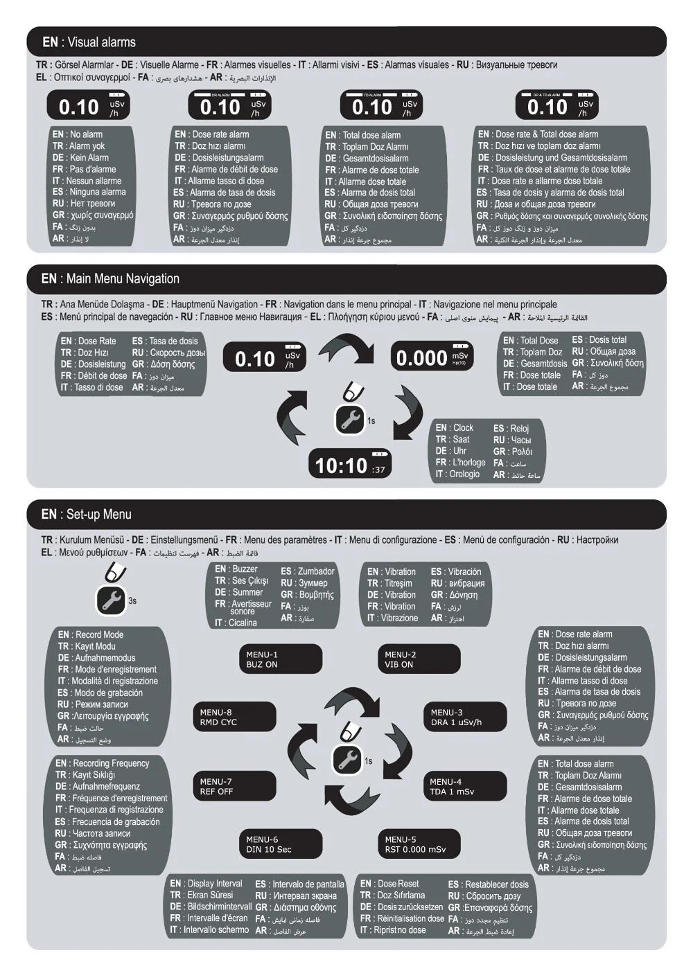 * Audio, Vibrating and Visual Dose and Dose Rate Alarm