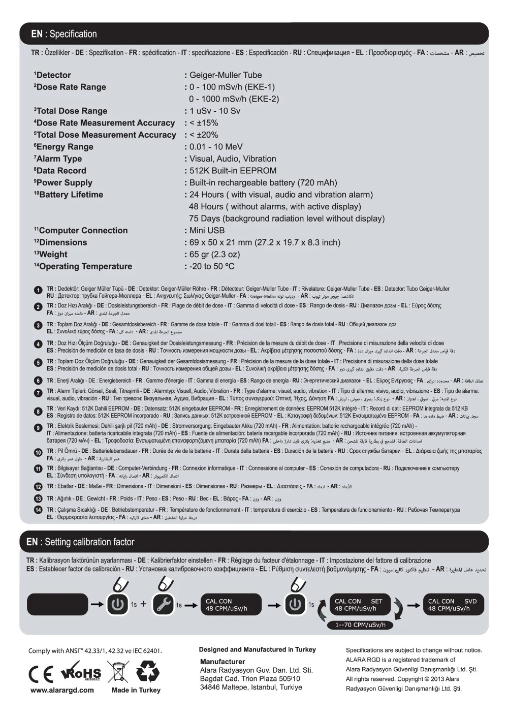 Package Content: EKE Series Personal Electronic Dosimeter, User Manual, Calibration Certificate, Warranty Card, Mini USB Charge and Data Transfer Cable