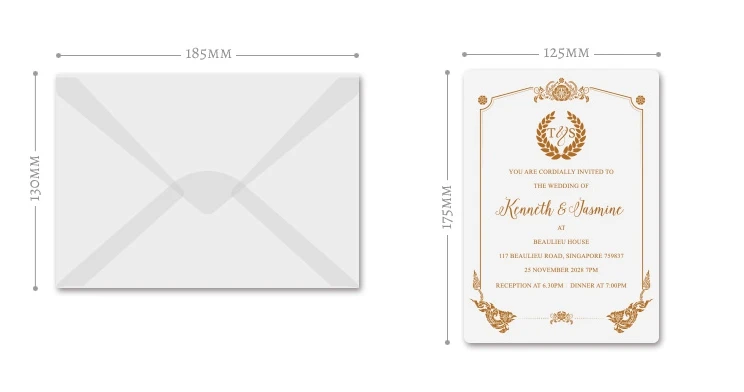 Technology: | Envelope :Foil, Acrylic invitation card: Silk printing Gold or white |